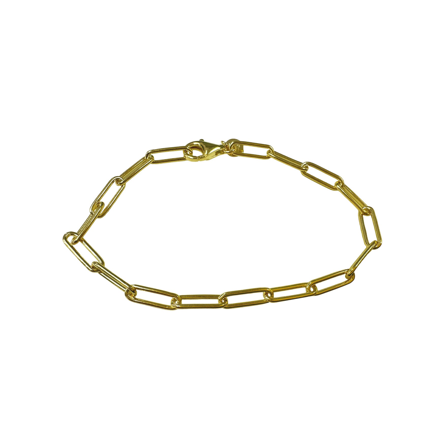 classic paperclip style link bracleet, this silver open link bracelet is great for everyday. Made of .925 sterling silver, plated in gold gold links have an open center for a lightweight chic look. Lightweight charms may be added, May be used for layering or for charm pendants. Beautiful alone. Polished finish. Lobster claw clasp. Italy.