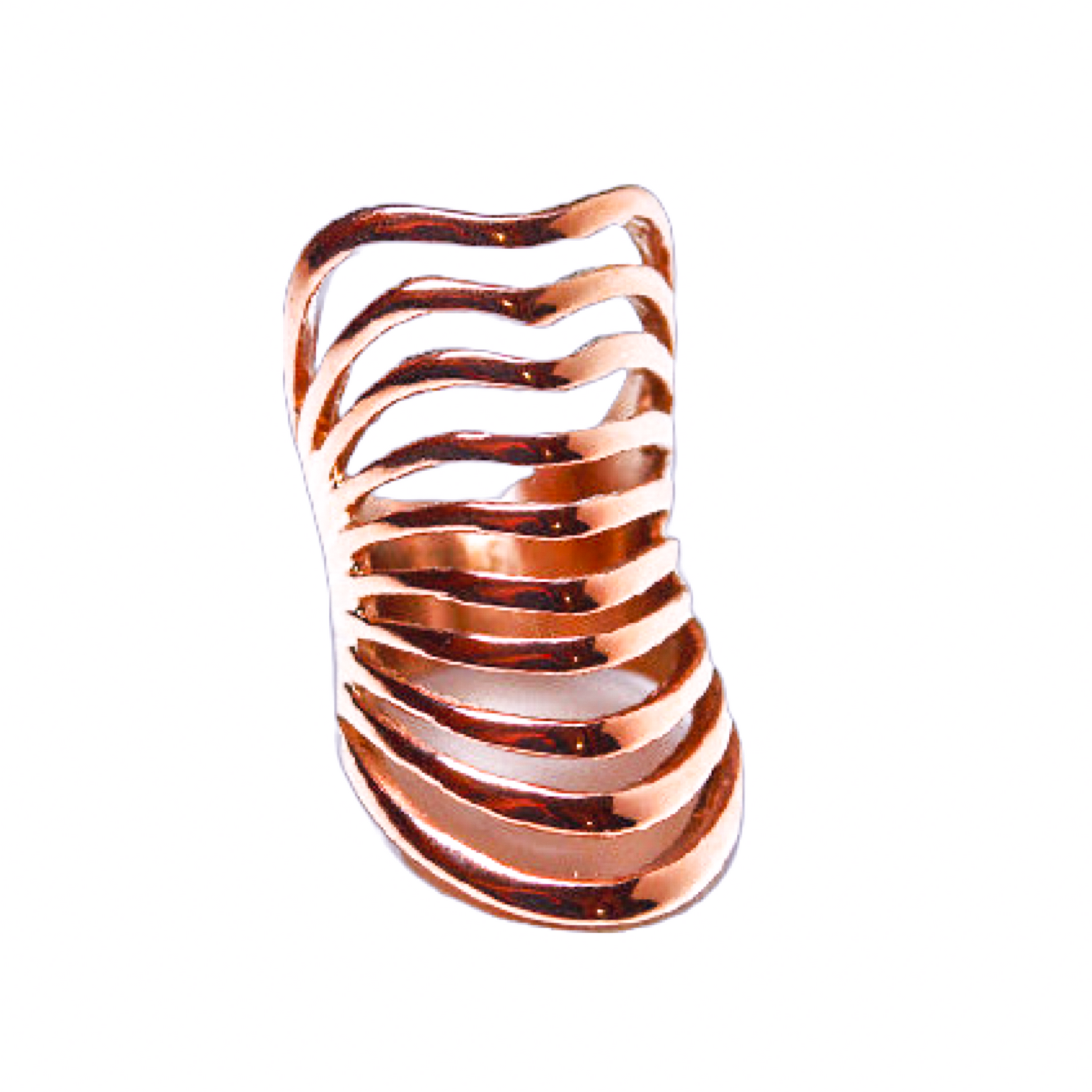 rose gold cage ring, Made of stainless steel. plated in rose gold, 2 inch length on finger.