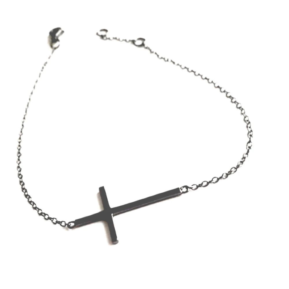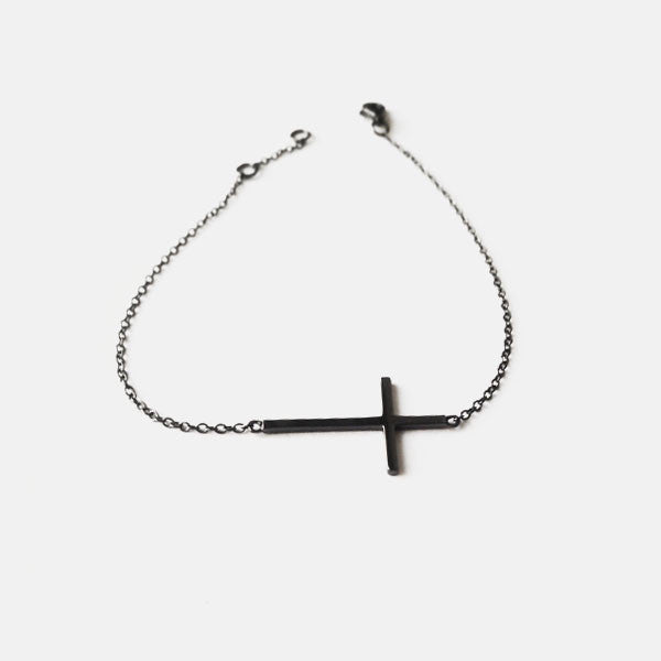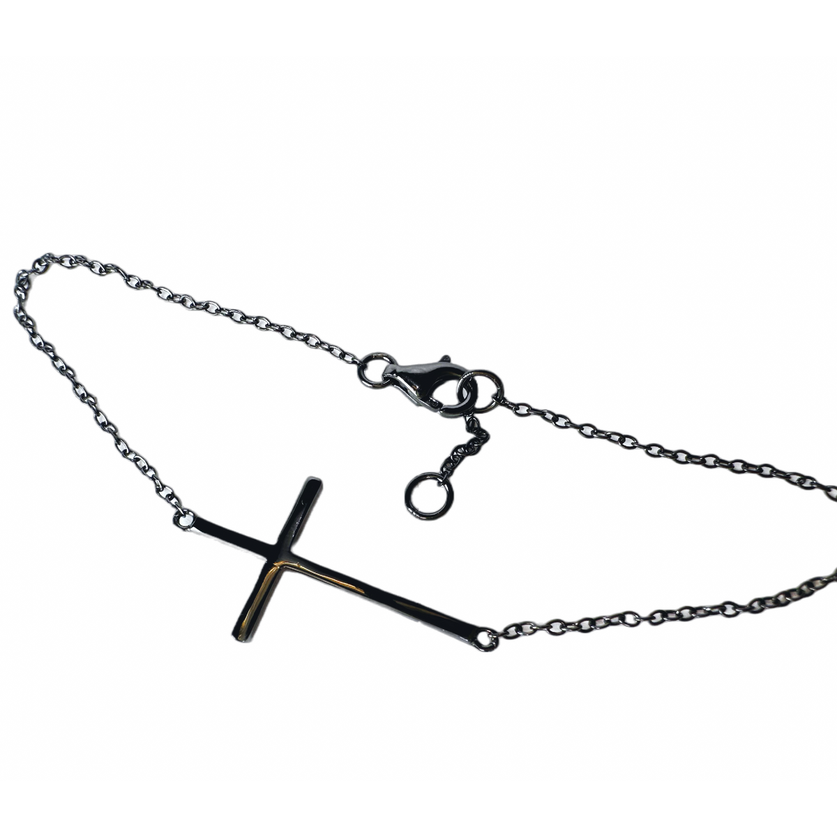 our ultra exclusive black sideways cross bracelet, made of .925 sterling silver. black silver dainty link chain features a black sideways cross charm at center. Cross Charm; .90 inch length x .47 inch height. We recommend keeping this product away from moisture for a darker lasting appearance.