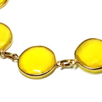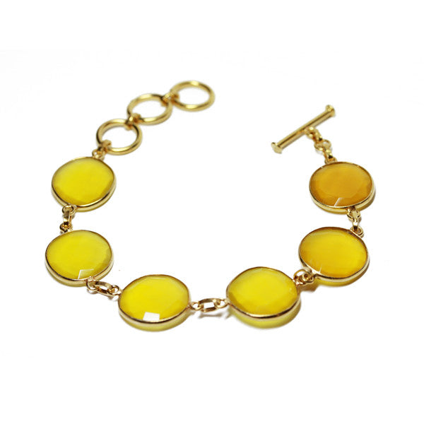 bright like the sun! pretty yellow onyx stone bracelet.  round stones are held together by gold-plated links made of sterling silver,  plated in yellow gold. dyed yellow onyx. Toggle Bracelet Closure