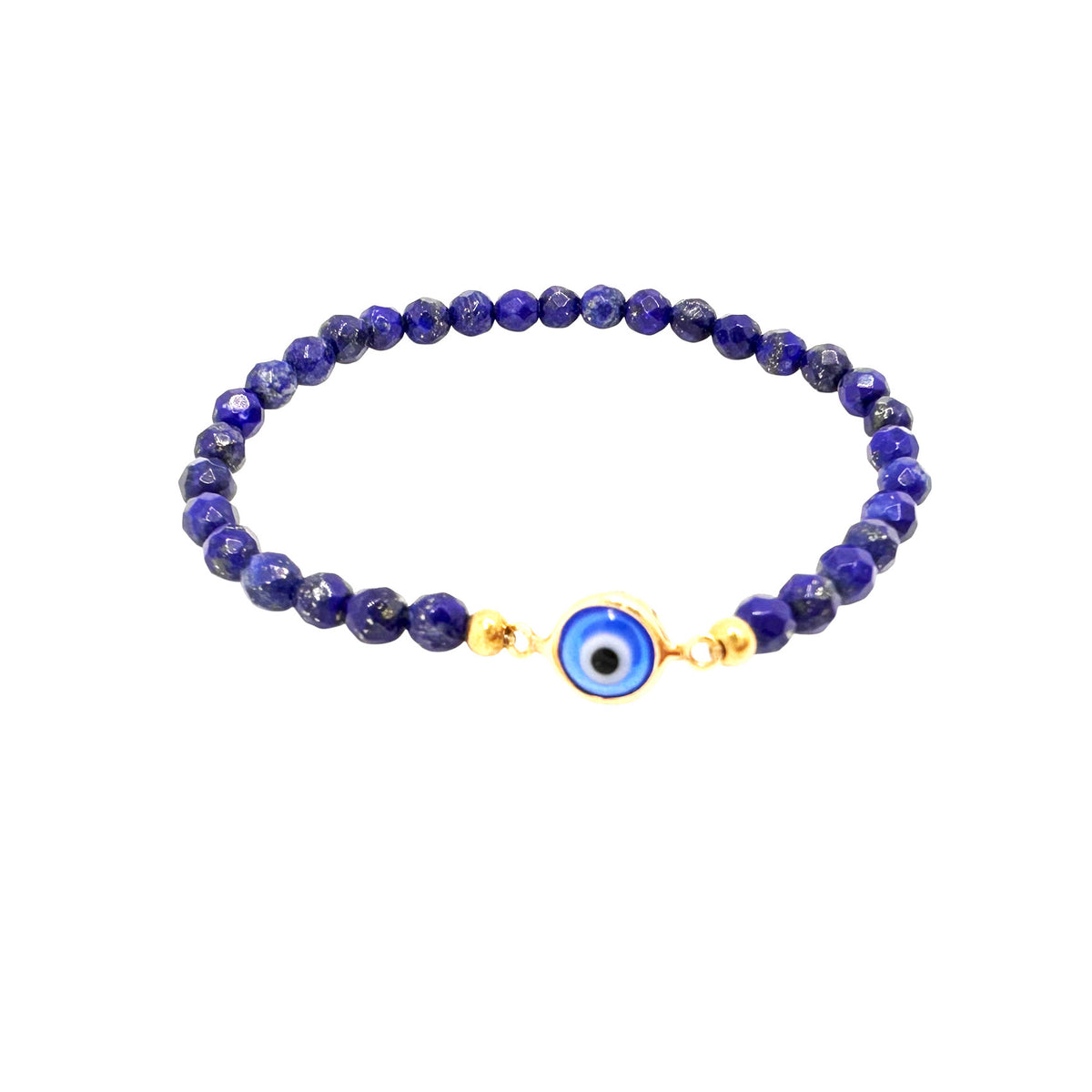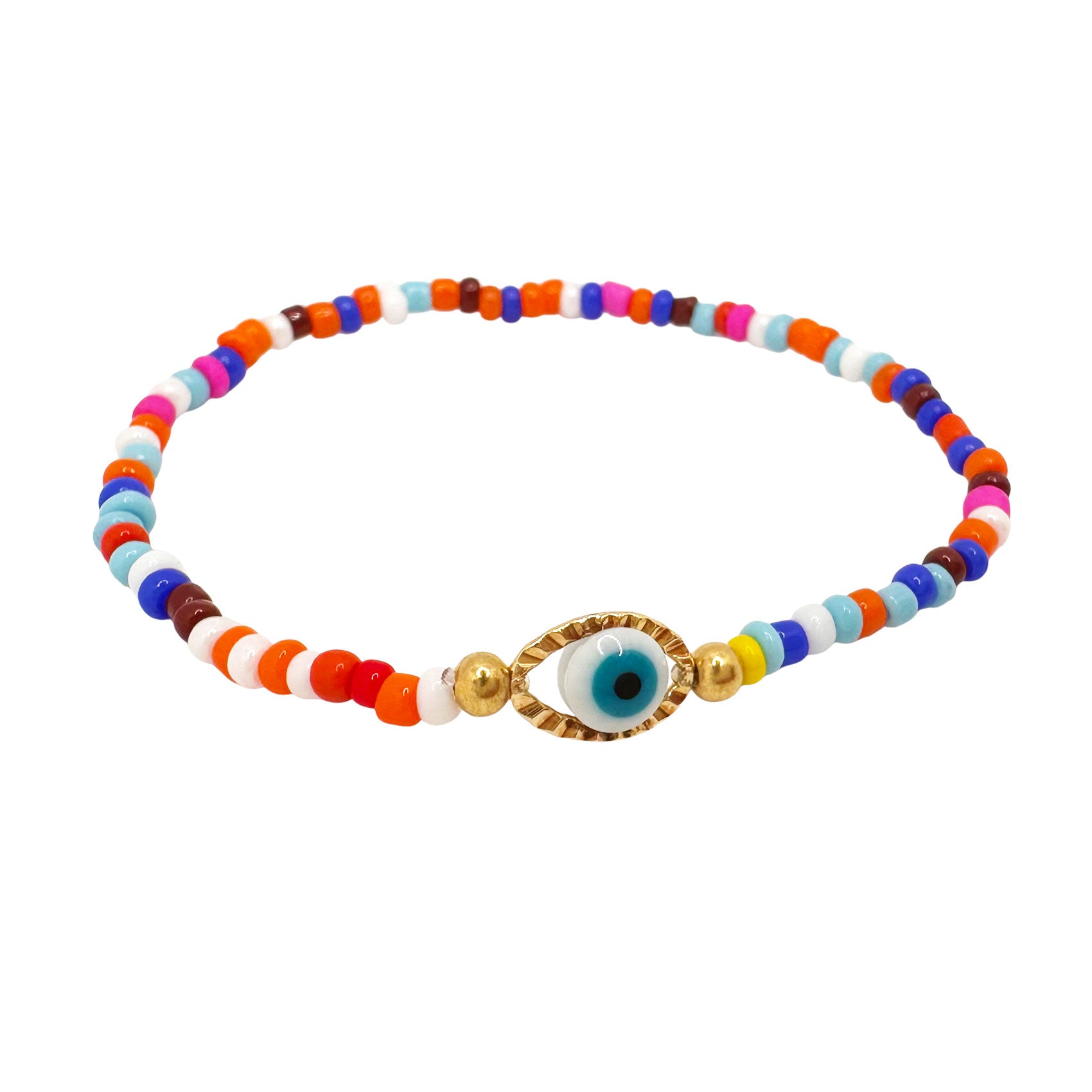 girls rainbow stretch bracelet, with vivid blue eye charms. Made of colorful beads. 4mm, faceted. .Stretch. Evil Eye bead charm. Fits most wrists. Hamsa charm instead of peace sign.