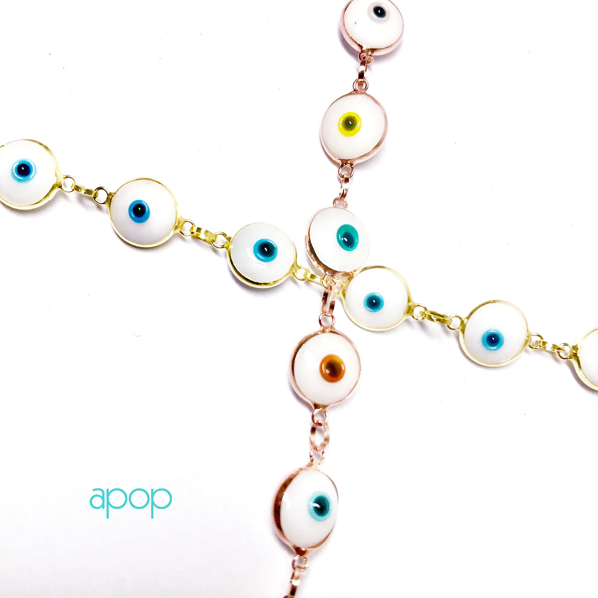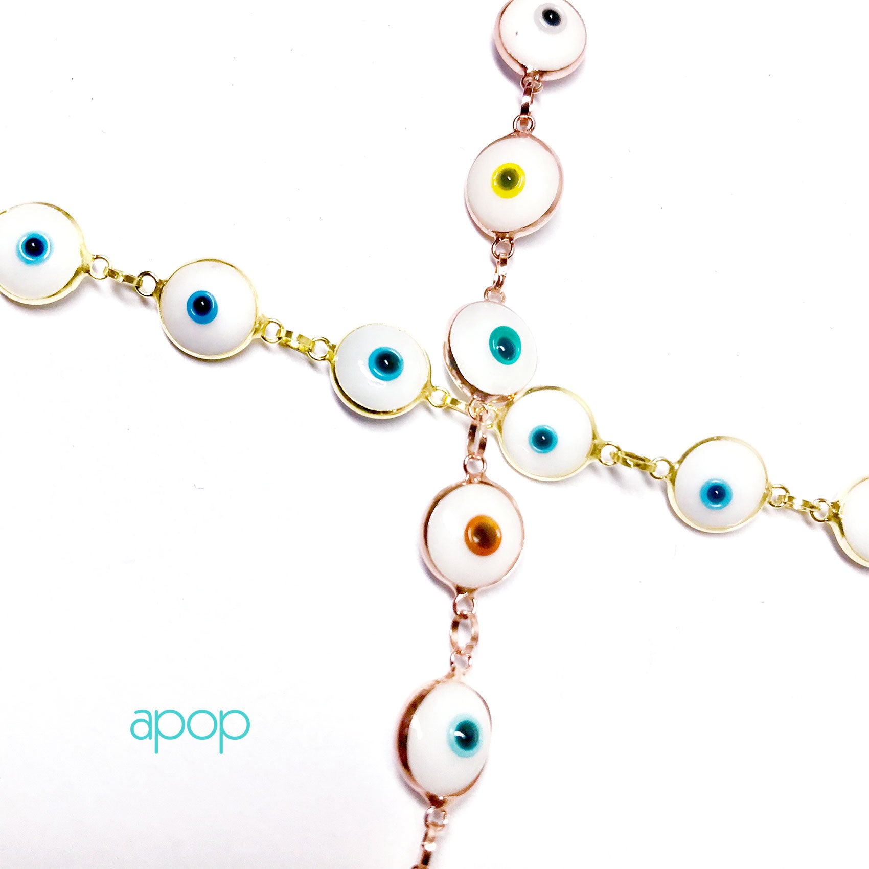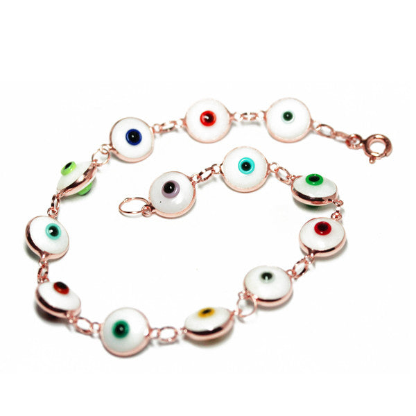 Unit price / perMade of .925 sterling silver, plated in rose gold. Spring Ring. Colorful Charms, ward off the evil eye with this cute rose gold eye bracelet. . Round eyes Motif, .25 inch x .25 inch