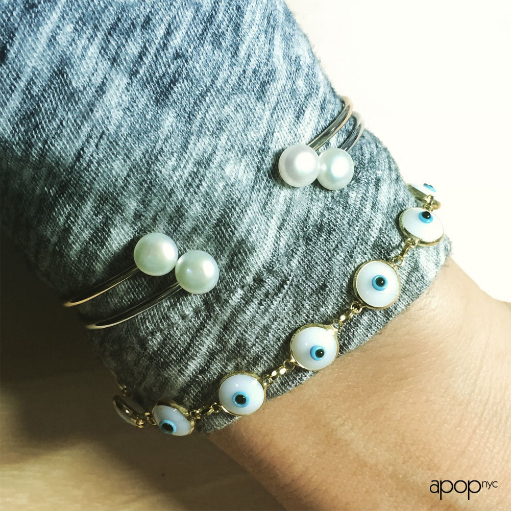 Made of .925 sterling silver, plated in rose gold. Spring Ring. Colorful Charms, ward off the evil eye with this cute rose gold eye bracelet. . Round eyes Motif, .25 inch x .25 inch