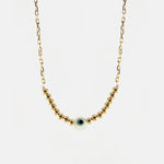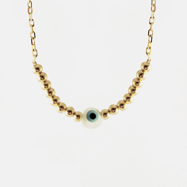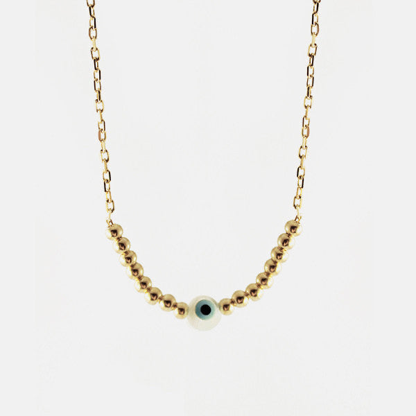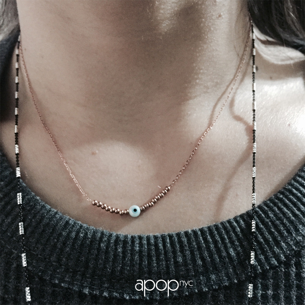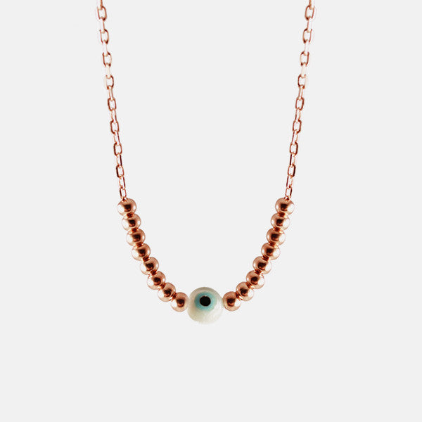 An evil eye necklace with a hip bar design. Made of .925 sterling silver dipped in rose gold. Features a gold plated beaded bar with a mini evil eye at center. Spring ring clasp. Adorn your neck in added style by layering with a peace sign necklace in rose gold. We recommend keeping this item away from moisture for a longer lasting finish