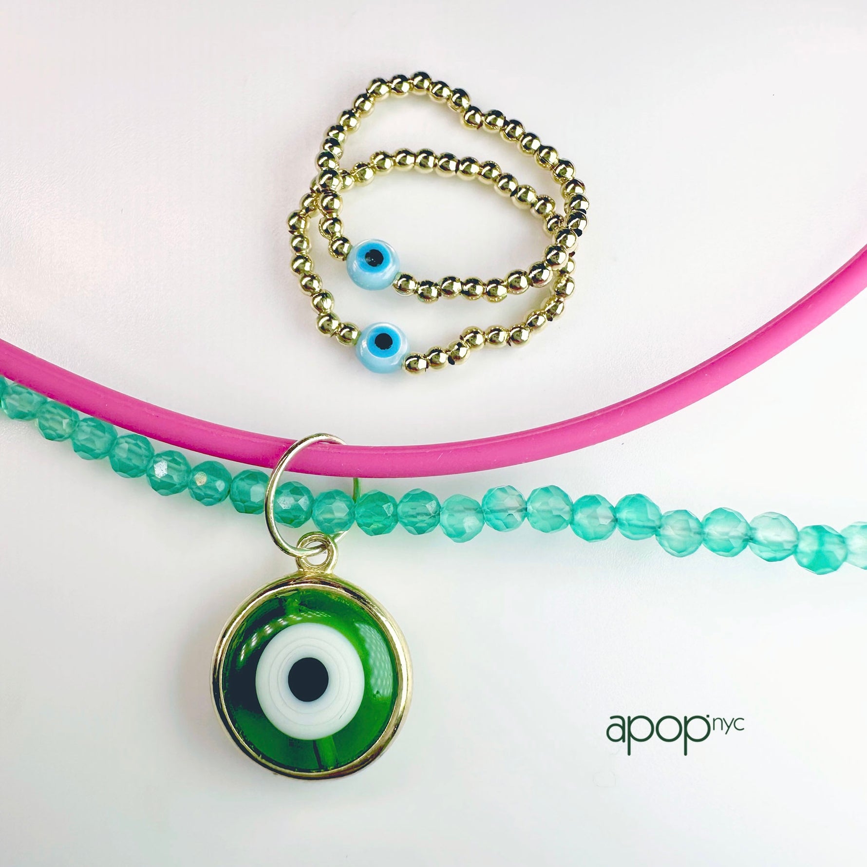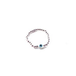 A great way to rock the evil eye, this rose gold stretch ring is stackable, versatile and simple. Made of .925 sterling silver beads dipped in rose gold. Small white evil eye bead with a blue-ish tint at center. Stretch ring for a comfortable fit. Thin band width gives this ring a delicate charm. Wear solo or stack up!