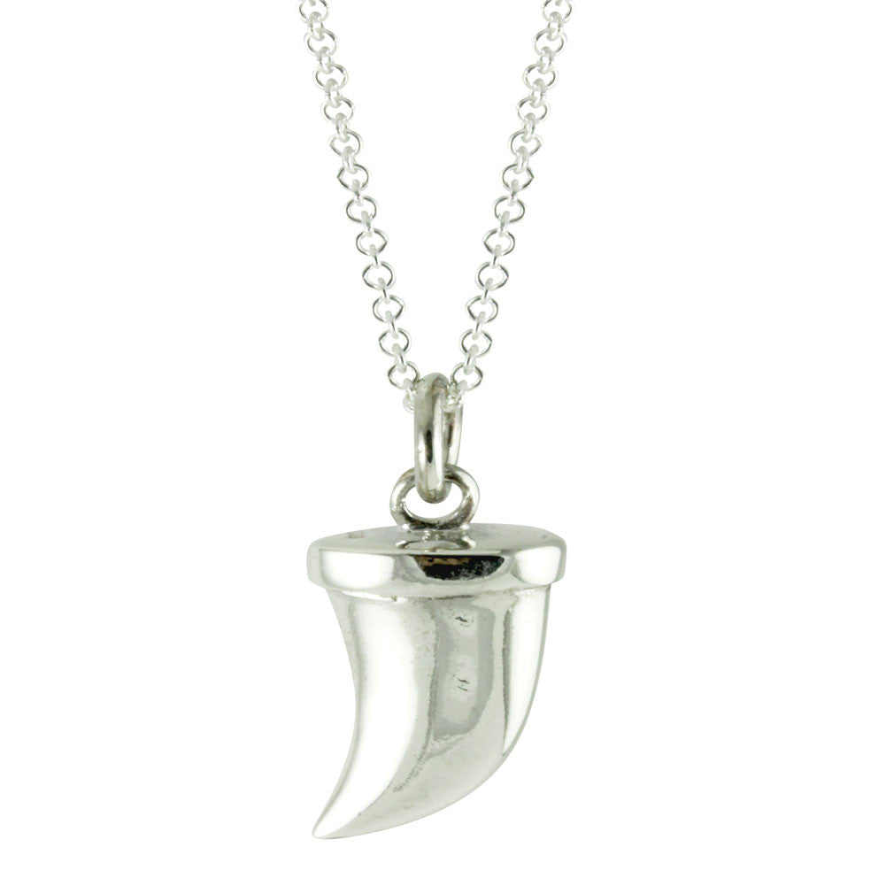 saber style tooth pendant, be fierce and wear a bit of stylish amulet with this simple yet meaningful saber tooth necklace. Made of .925 sterling silver. Featuring a small-medium pendant with an intricate tooth design. Wear alone or layer.