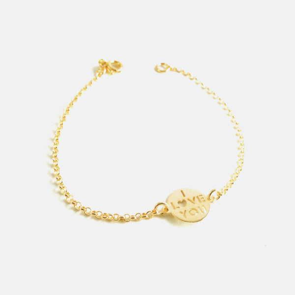 Say "I Love You" with a stylish & simple circle charm bracelet. Made of .925 sterling silver and dipped in yellow gold. Polished finish. Featuring a circle disc with the words "I Love You" cutout in stencil style at center. Love is spelled with a heart for some added sentiment. Sturdy chain with spring ring clasp for closure. Layer with a heart pendant bracelet for double the love.