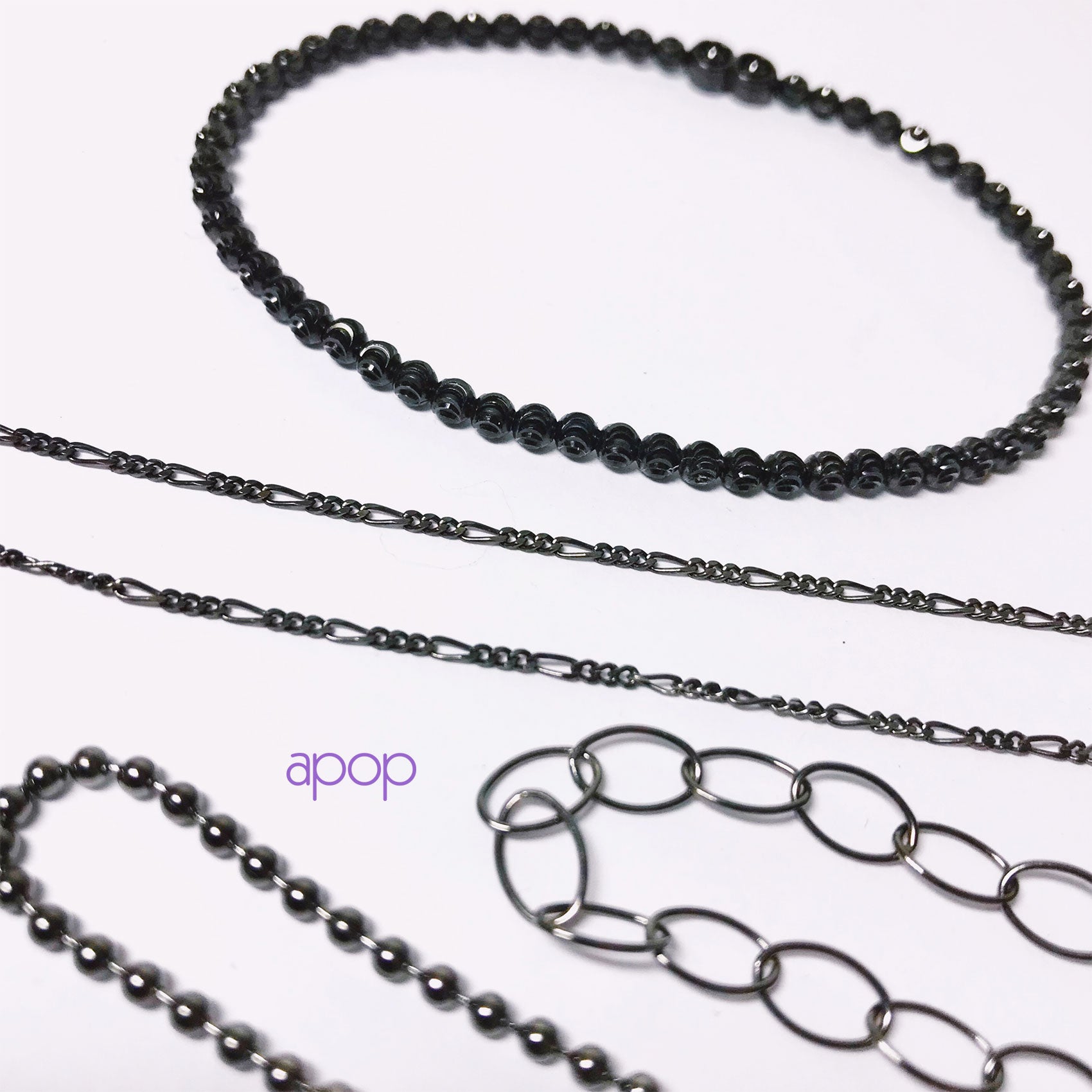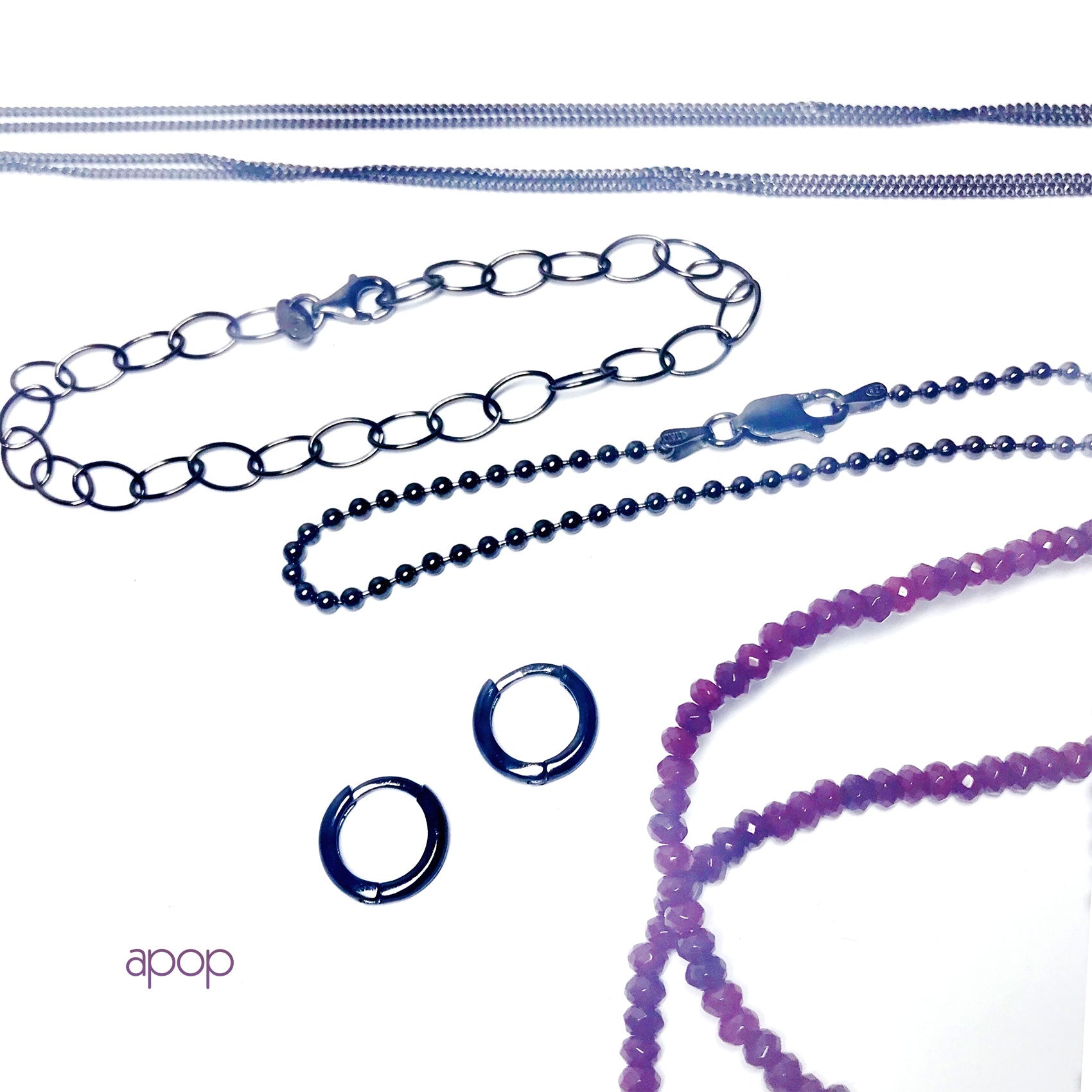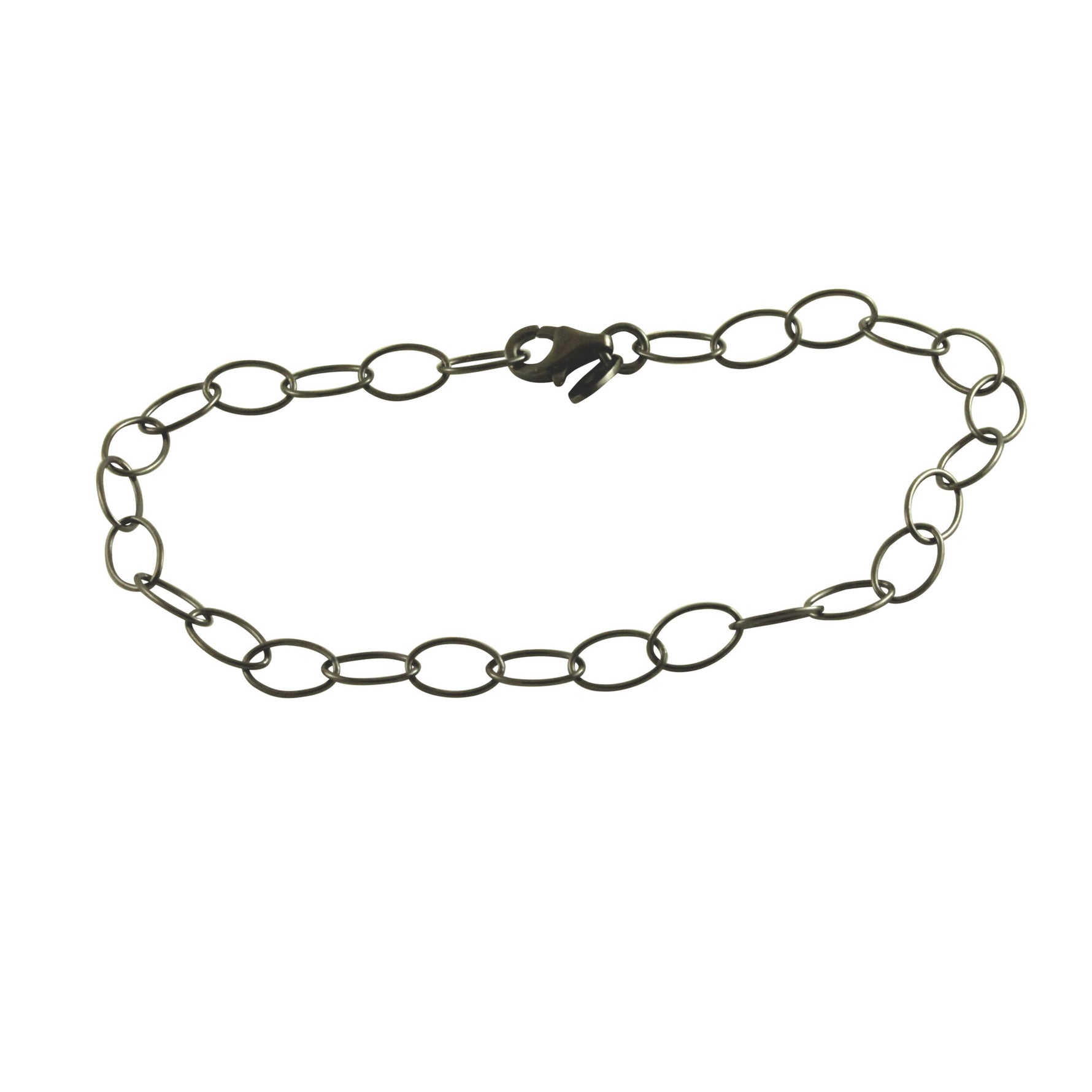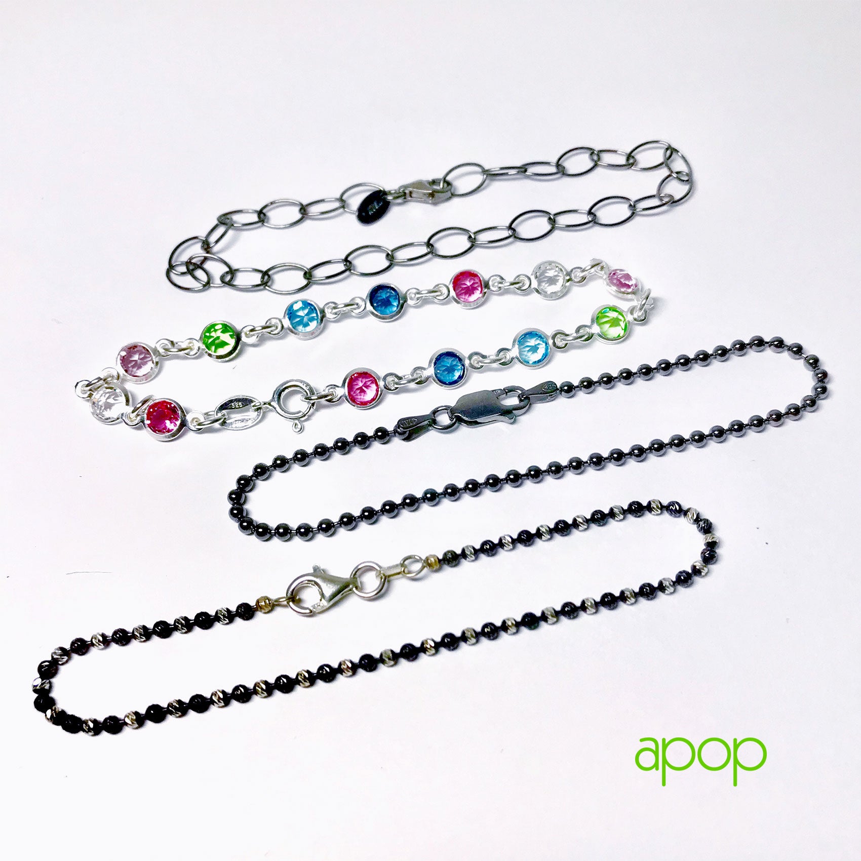 apop's Daisy bracelet in blackened Silver! black wide open link bracelet. Made of .925 sterling silver, dipped in black rhodium. single strand black link featuring simple round wide open links. May be adjusted to shorter lengths with links. Black jewelry is an apop staple!