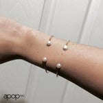 "buttons" is our double pearl cuff bracelet, fit for a princess. Made of .925 sterling silver dipped in rose gold, and freshwater cultured button pearl. Smooth polished finish. Thin round design , perfect for stacking. 3mm bangle. Pearls are 7mm. Slight maleable for adjustment.