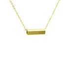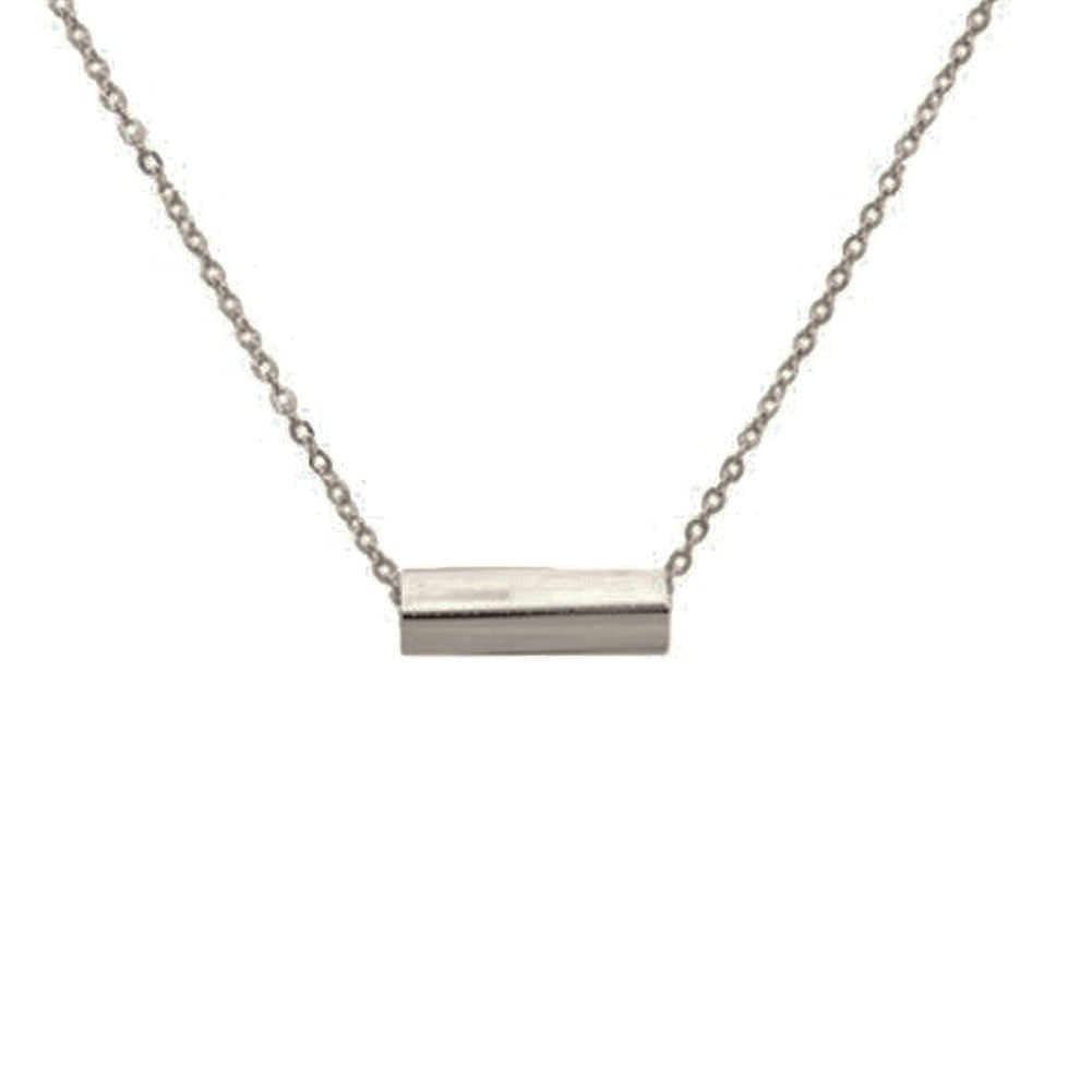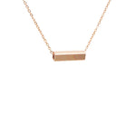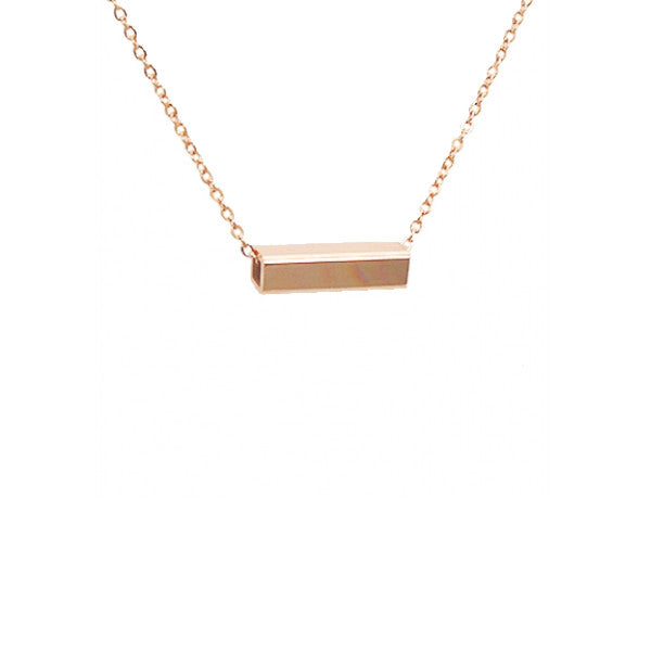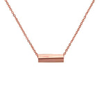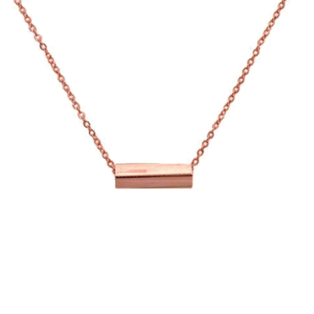 A fabulous yet understated rose gold rectangle bar necklace Made of .925 sterling silver, plated in rose gold. Featuring a dimensional rectangle bar at center. Horizontal bar has a beautiful polished finish. Spring ring clasp. The epitome of versatile, this rose gold bar necklace can stand alone or great for stacking with other necklaces