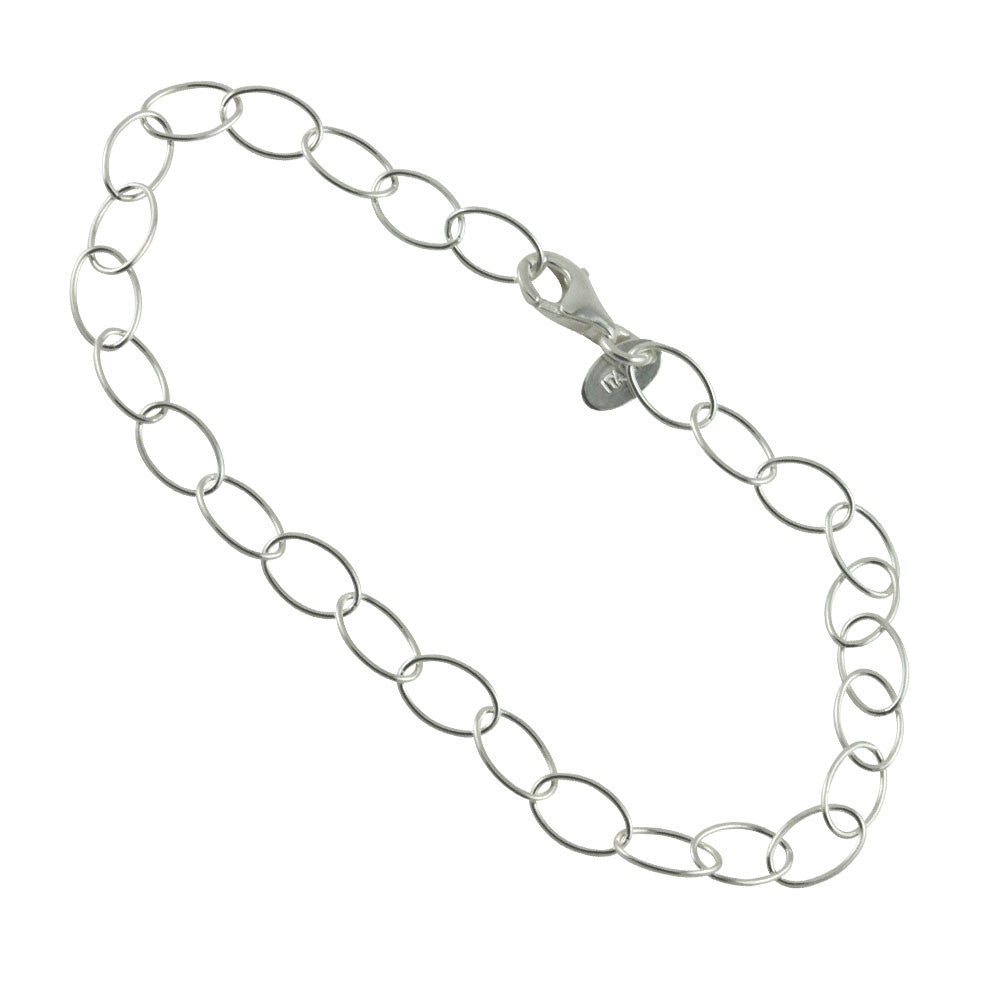 Daisy is our classic link collection, this silver open link bracelet is great for everyday. Made of .925 sterling silver.Silver links have an open center for a lightweight chic look. Lightweight charms may be added, also since there isn't a designated closure loop, it may be adjusts to fit desired link and remaining links will dangle charmingly. May be used for layering or for charm pendants. Polished finish. Lobster claw clasp. Italy.
