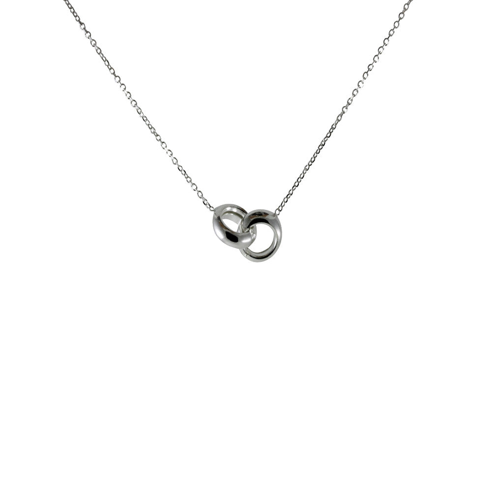 A beautiful and iconic "love lock", our interlocking rings necklace is both practical and glamorous. Made of Italian .925 sterling silver. Polished finish. Features two small circular rings that are connected in an infinite arrangement. A necklace that exemplifies sophistication and elegance. Wear casually or dress this necklace up with sterling silver stud earrings.