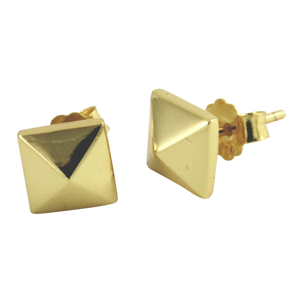 Simple and street-chic, these pyramid stud earrings are an essential. Made of .925 sterling silver and dipped in yellow gold. Studs are crafted with an edgy structured three dimensional design. These earrings will make any outfit look cool. Post earrings. Polished finish. Pair with our pyramid stud necklace for double the power. We recommend keeping this item away from moisture for a longer lasting finish.
