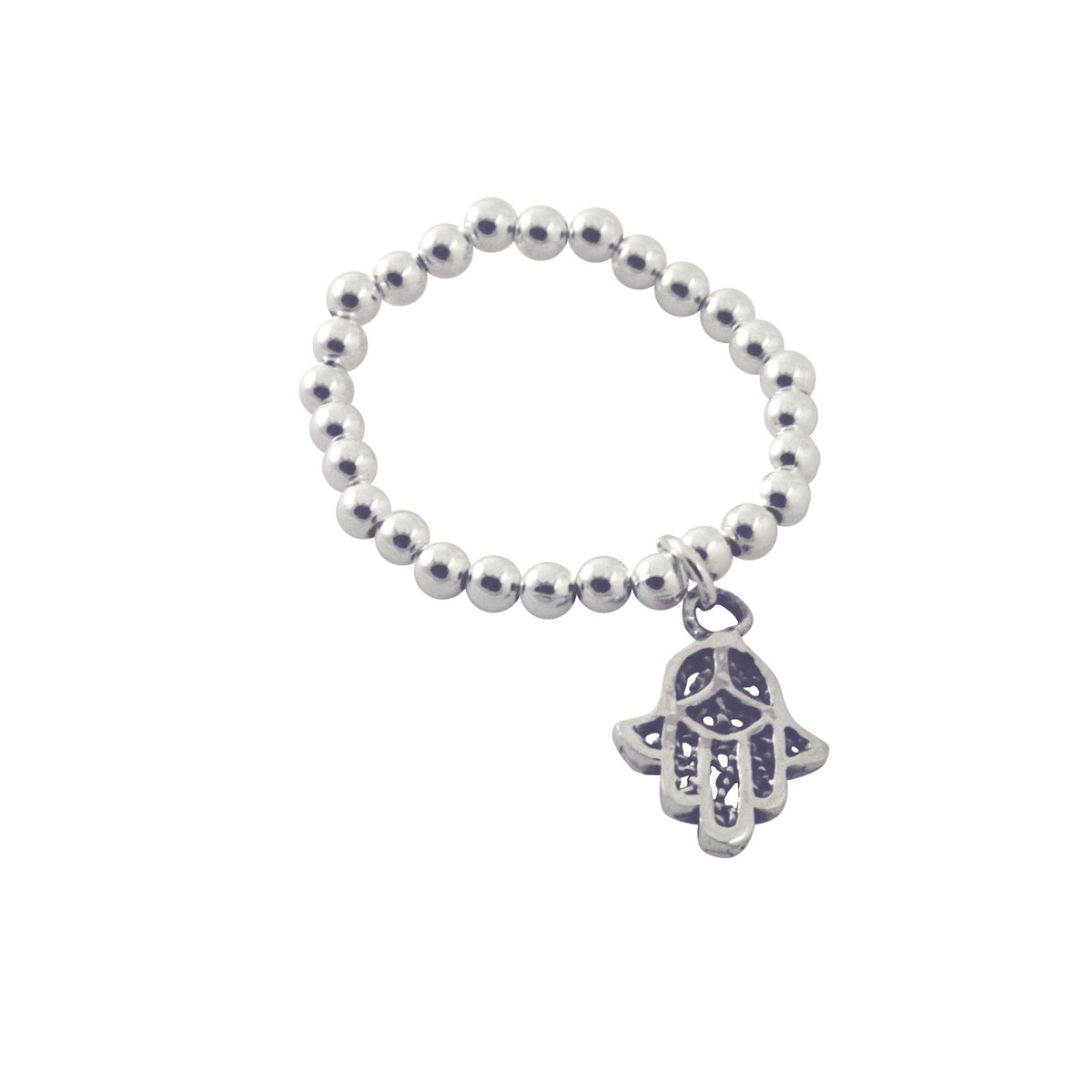 beaded stretch ring; this sterling silver stretch ring is stackable, versatile and simple. Made of .925 sterling silver beads. Small hamsa charm with a filigree style. Stretch ring for a comfortable fit. Thin band width gives this ring a delicate charm. Shop yours!
