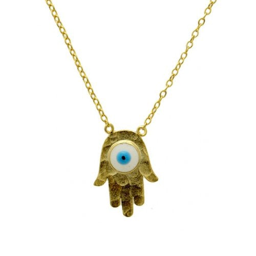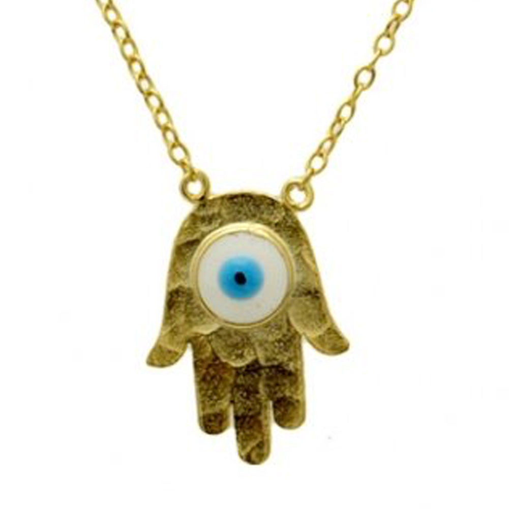 Unit price / perOur "Eye of Providence" necklace is a unique combination of two meaningful symbols. Made of .925 sterling silver and dipped in yellow gold. Featuring a yellow gold plated hammered hamsa at center. Beautiful blue and white enamel eye of providence set in center of hamsa gives necklace a special charm. Rolo chain with spring ring clasp. Looks fashionable when layered with other yellow gold necklaces.