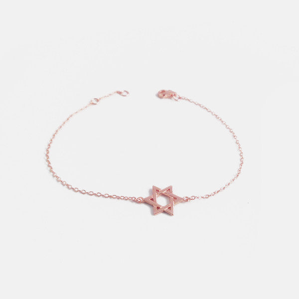Unit price / perOur Star of David bracelet is the perfect symbol of faith. Made of .925 sterling silver and dipped in beautiful rose gold. Features a classic rose gold plated Star of David at center. Polished finish. Lobster claw clasp. Looks elegant paired with a rose gold mini solitaire stone bracelet.
