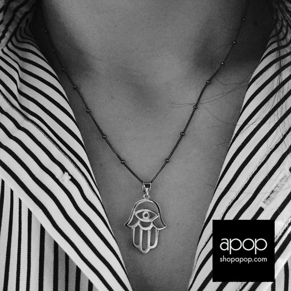 apop exclusive hamsa necklace is a unique combination of two meaningful symbols; hand of god and eye to ward off unkind spirits . Made of .925 sterling silver. Featuring a plain silver hamsa with an etched eye of providence set in center. Black chain is 925 silver and oxidized for a gorgeous black finish. Black & Silver, a stylish combination!