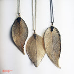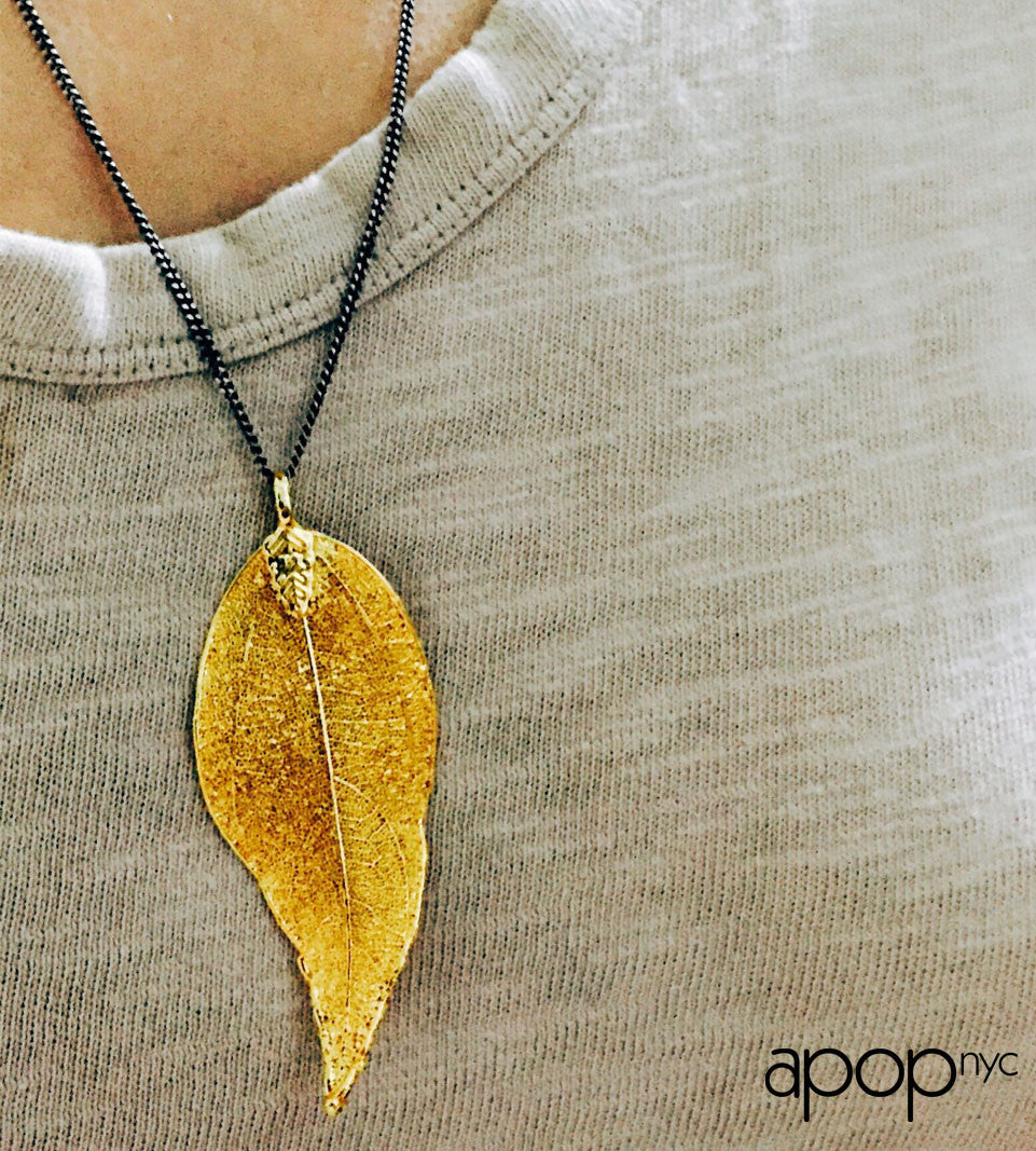 Our "Fly as a Leaf" is uber chic. Made from a natural leaf stripped from the greenery, leaving just the veins casted in metal for reinforcement then dipped in yellow gold for a gold-plated finish. Gorgeous Gold leaf pendant may be used on your favorite necklace or purchase your own chain, select a black chain for a unique look, or silver for a fancy yet delicate style.