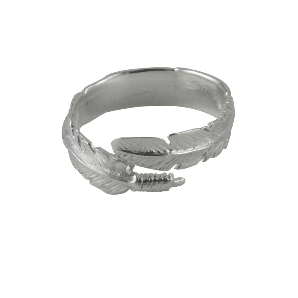 silver feather ring is made of solid .925 sterling silver Featuring a solid flat band wrap around feather with intricate detail. slightly maleable for adjustment. Satin Polished finish. Ring Sizing Guide