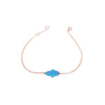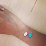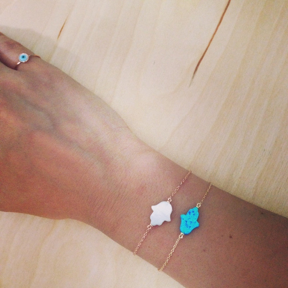 A simple blue hamsa with a stylish design. Made of .925 sterling silver. Features a sideways blue opalite hamsa at center. Silver hamsa lends a dainty appeal. Polished finish. Deck your wrists with multiple dainty charm bracelets for an ultra chic appeal and wear a bit of good protection.