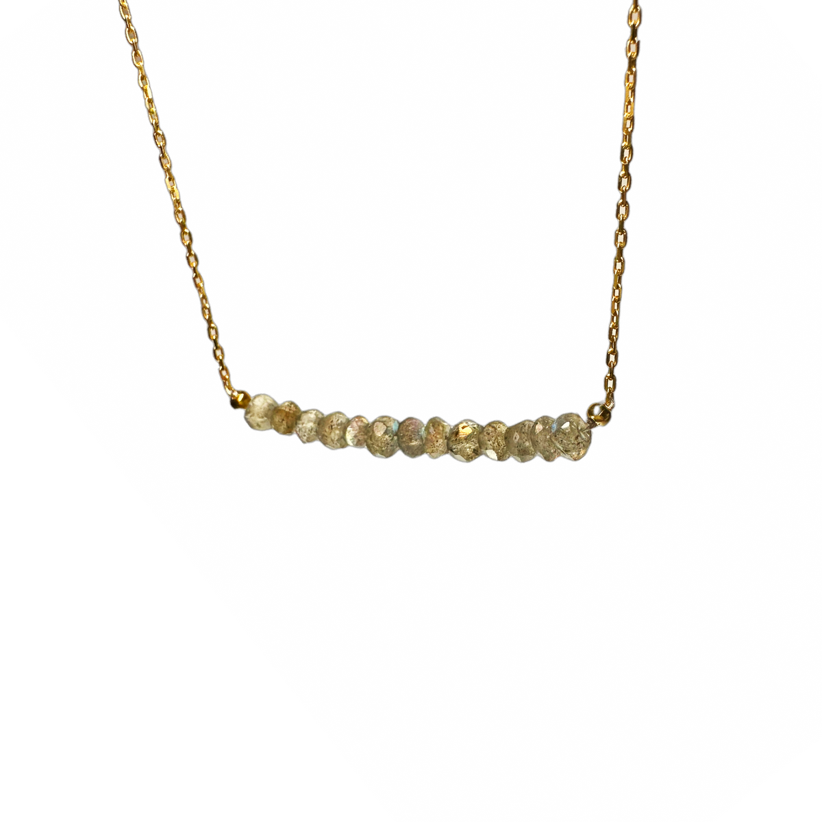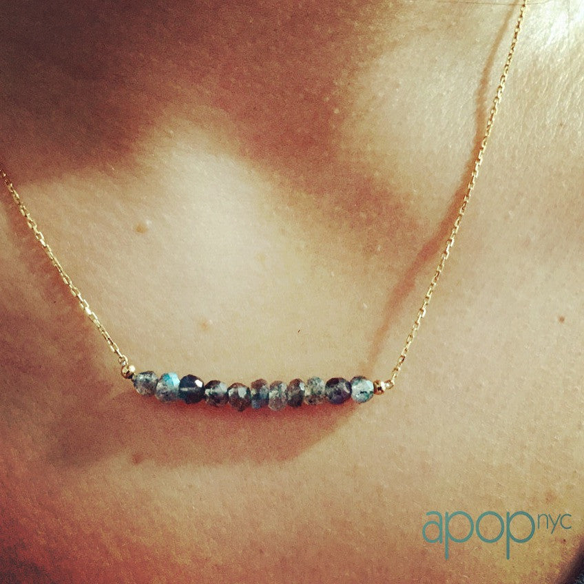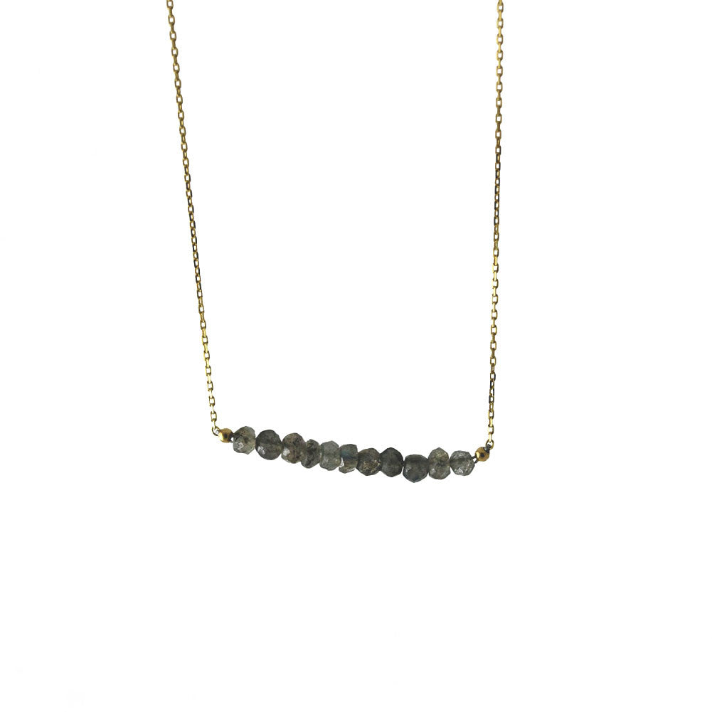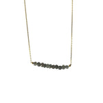 sassy labradorite stone bar necklace. Made of .925 sterling silver and dipped in yellow gold. Featuring small grey stones in bar motif at center. Delicate rolo chain with spring ring clasp.