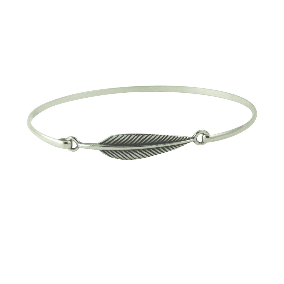 - Dainty Feather Bangle, Made of .925 sterling silver. Intricate detail, feather features a darkened finish. Thin design , perfect for stacking. 2mm thick. Feathers are approximately 1 inch. Slight maleable for adjustment.