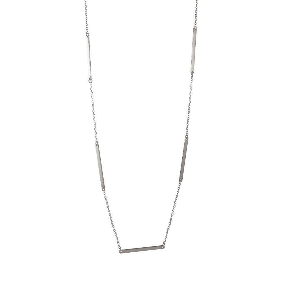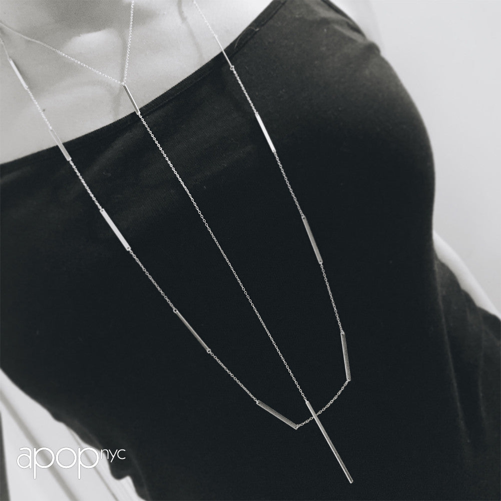 silver thin bar link necklace, made of sterling silver. polished finish, Silver chain features a rectangle bar pendant. 36 inch length is great for double strand necklace.