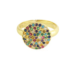 Unit price / perA stunning and colorful pavé cubic zirconia rainbow ring. Made of .925 sterling silver and dipped in yellow gold. Polished finish. Features a perfect multicolor cubic zirconia pave disc at center with a glimmering effect. Looks great with multicolor jewelry.