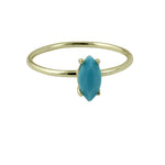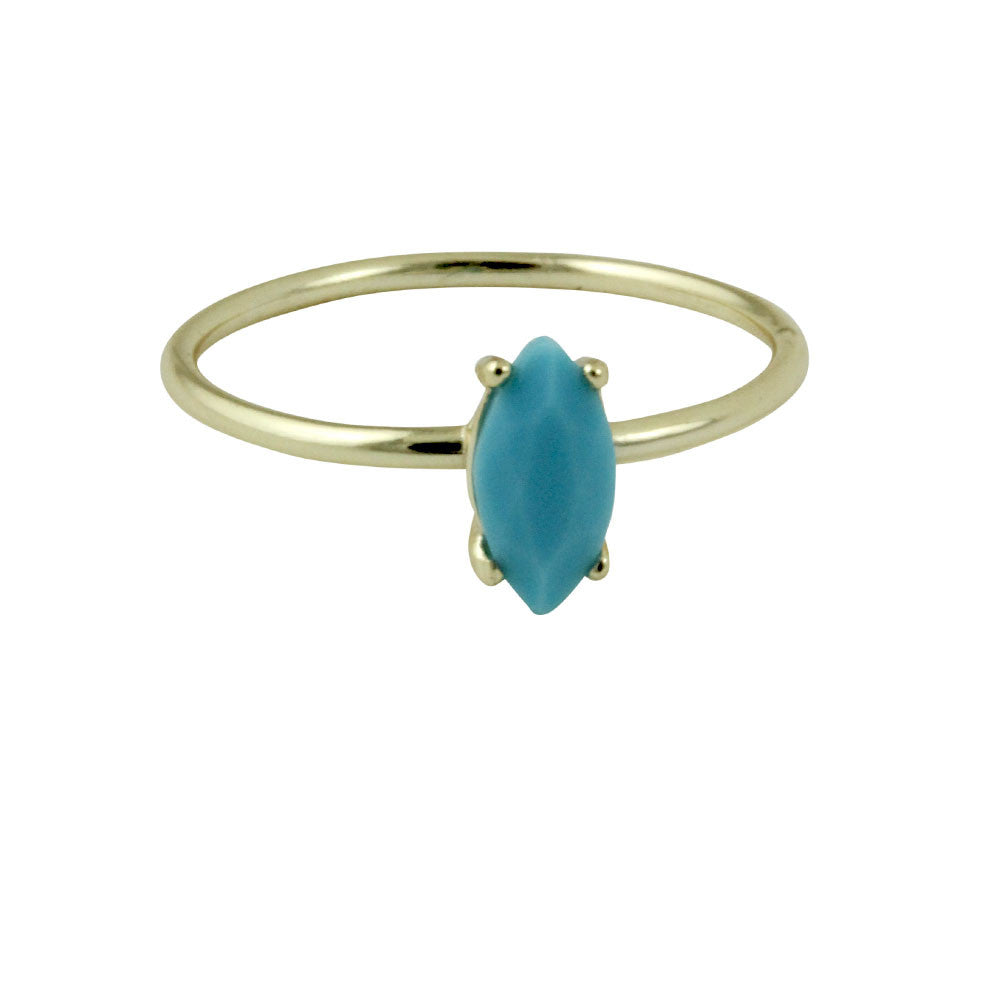 stacking simulated turquoise ring, featuring a robin blue marquise cut stone ring. Made of .925 sterling silver and dipped in yellow gold. Polished finish. Features a simulated turquoise center in a marquise shape. Looks great with other gold stacking rings.