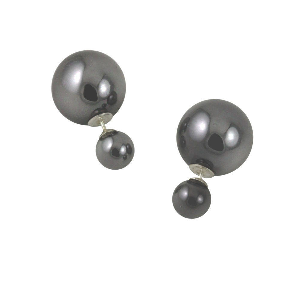 a super modern pair of double bead earrings, made of sterling silver post, hematite tone beads for a fabulous contrast with dark gray, "almost black" ends. although these daring double sided tribal earrings seem to carry weight, they are soft on the earlobes. Simple yet fabulous.