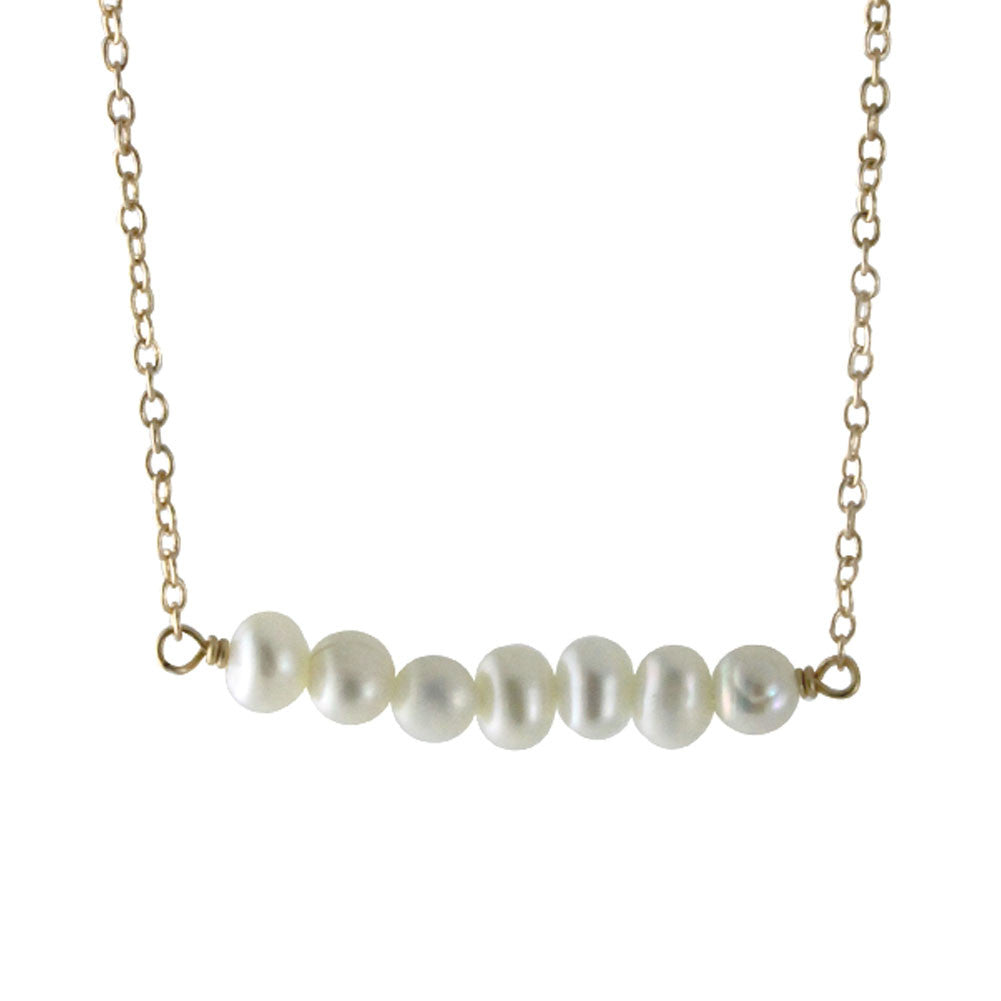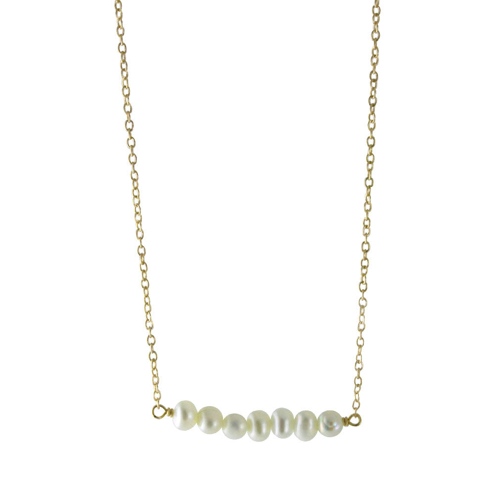 Natural pearl bar necklace. Made of .925 sterling silver and dipped in yellow gold. Featuring small pearls in bar motif at center. Delicate rolo chain with spring ring clasp. Complementing gold vermeil "baroque" single pearl bracelet available.