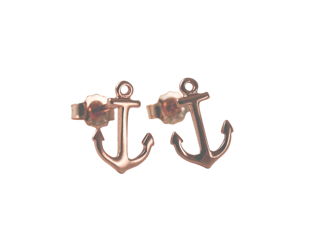 Rose Gold anchor earrings, made of .925 sterling silver. Plated in rose Gold/gold. Stud earrings. Delicate nautical anchor design.