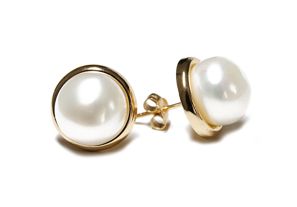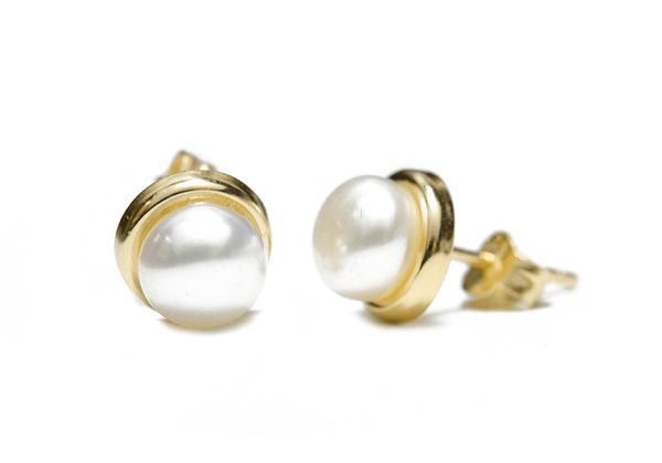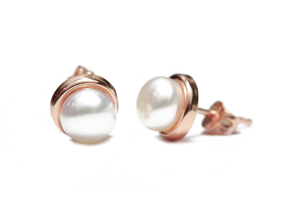 A classic pair of rose gold pearl stud earrings. Made of .925 sterling silver, plated in rose gold. Bezel setting. polished finish. Features beautiful freshwater cultured pearl 7mm at center. Can be worn alone or paired with complementing mini pearl ring