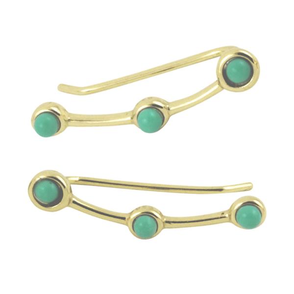 Introducing this fresh and versatile climber earrings to our turkoise collection, modern and understated, Made of .925 Sterling Silver featuring a three blue dots set.  Plated in Yellow Gold. Snug Design. Single Pin Earring. May be worn upright or  horizontal. Sold as a Pair.
