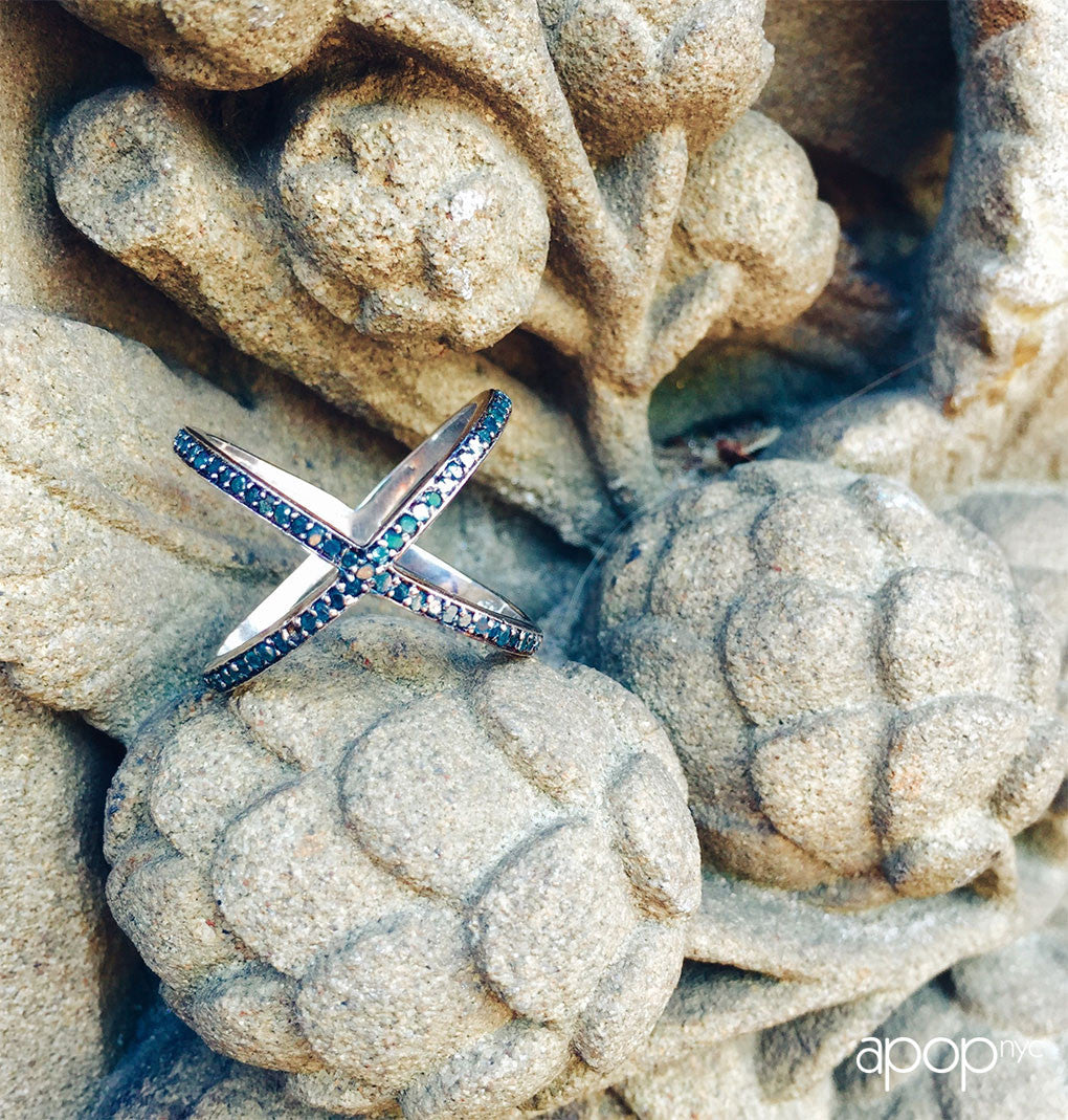 Stunning! Edgy silver Diamond X band ring is made of solid .925 sterling silver. Featuring an "X" design with dazzling blue diamonds. A black finish setting to highlight blue color diamonds. great for pointer ring, knuckle ring, middle ring. Cocktail ring or everyday wear. polished finish. Ring Sizing Guide
