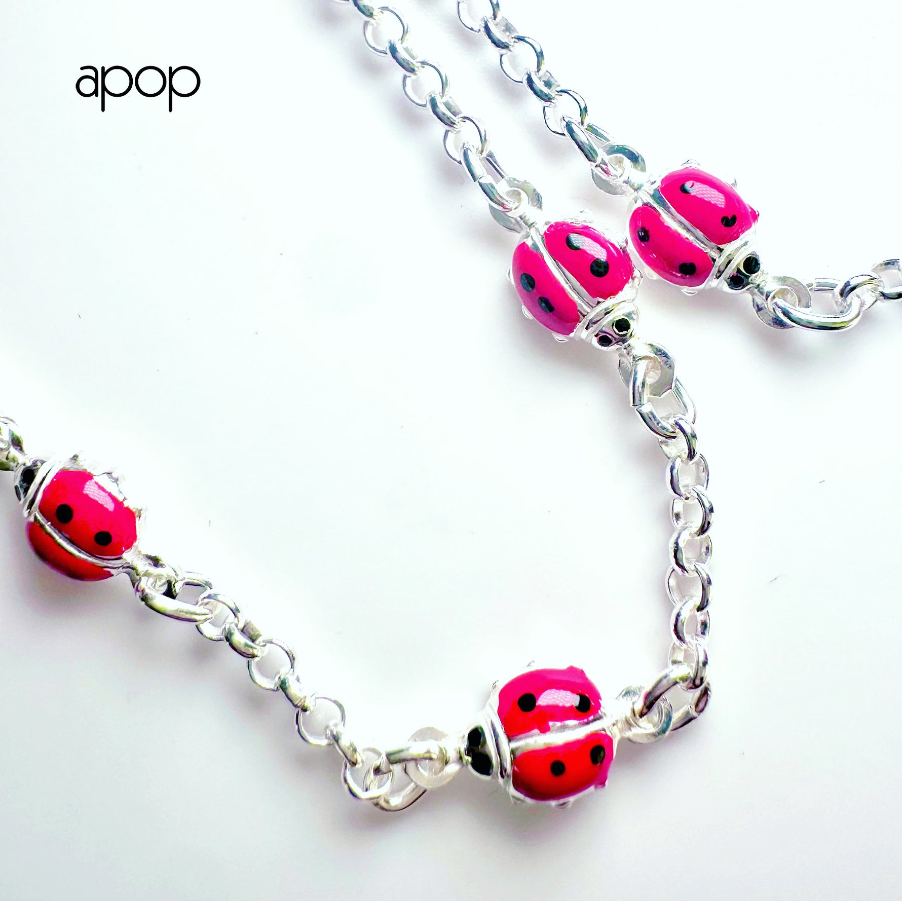 Wear a little bit of luck everyday with this adorable ladybug charm bracelet. Made of .925 sterling silver Featuring a small enamel ladybug in black and red at center of bracelet. Cute Ladybug clasp. 7 inch