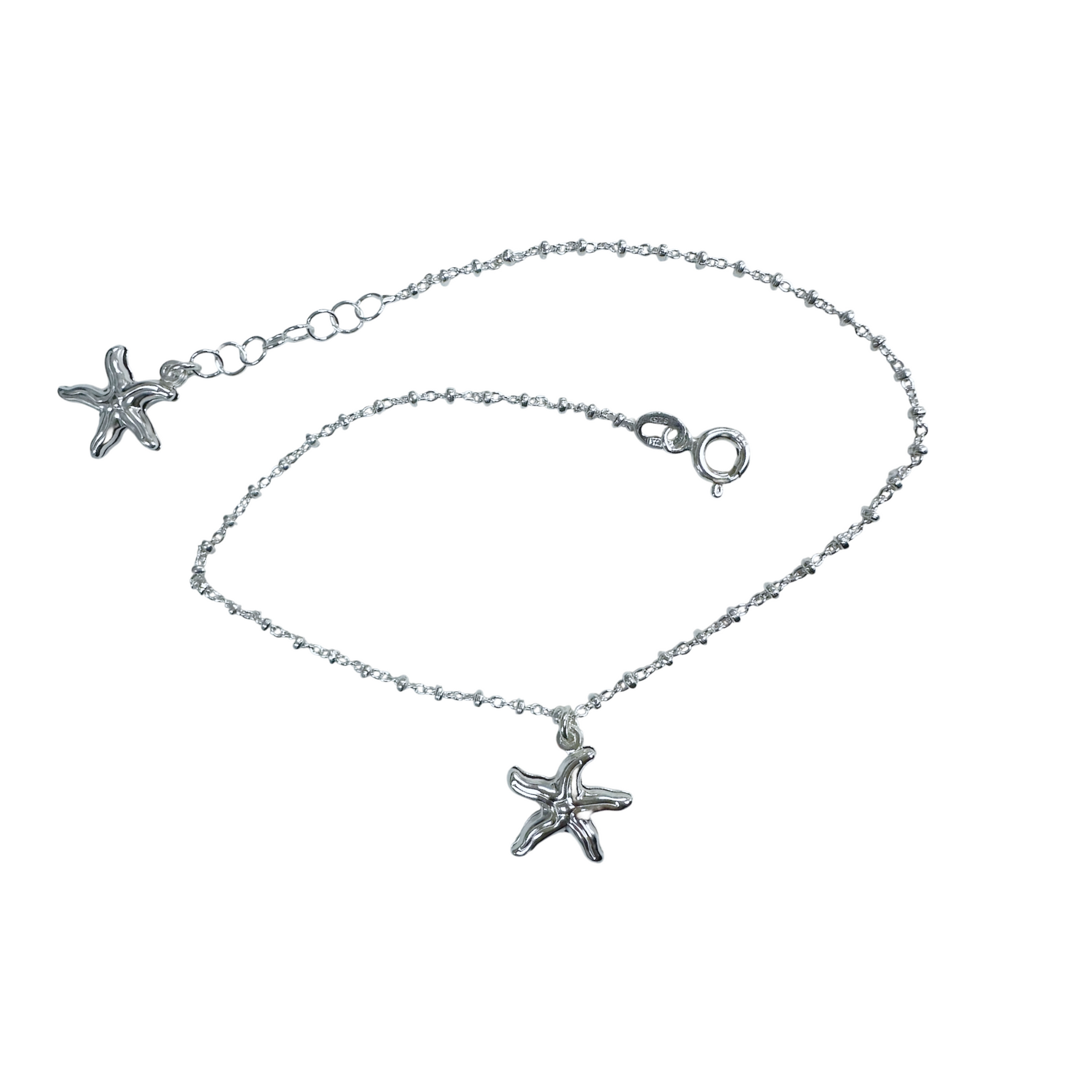 Beautiful ocean starfish anklet. Made of .925 sterling silver. Features two star fish charms. Polished finish.