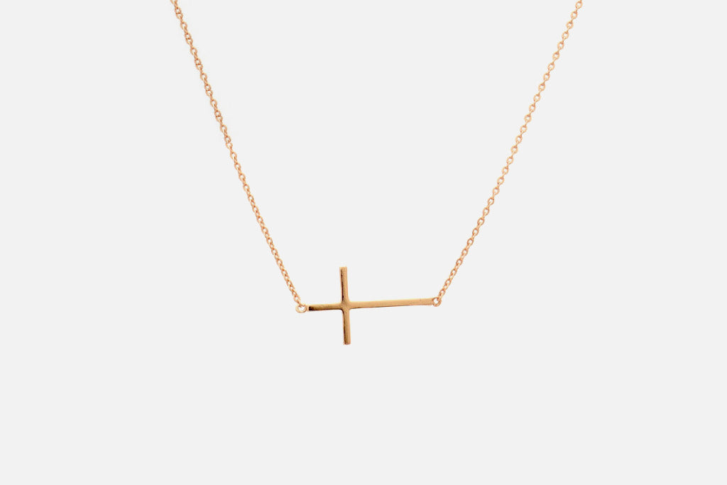 Made of solid .925 sterling silver. Plated in Rose Gold. rose gold plated silver dainty link chain features a a thin sideways cross charm at center. Spring Ring clasp. Cross Charm; .90 inch length x .47 inch height