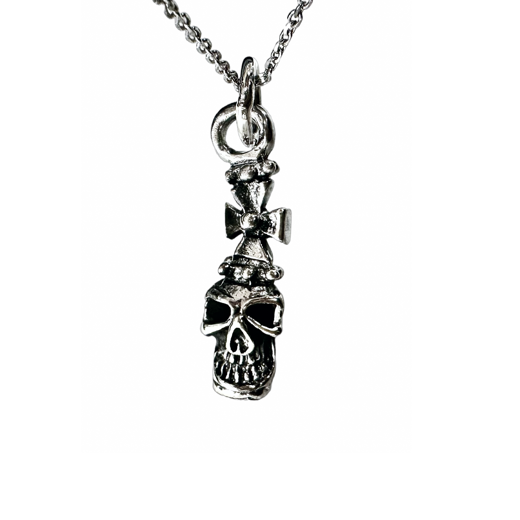 Unit price / percross and skull pendant necklace. Made of .925 sterling silver. Features a silver skull head and cross design pendant. Cool and macabre.