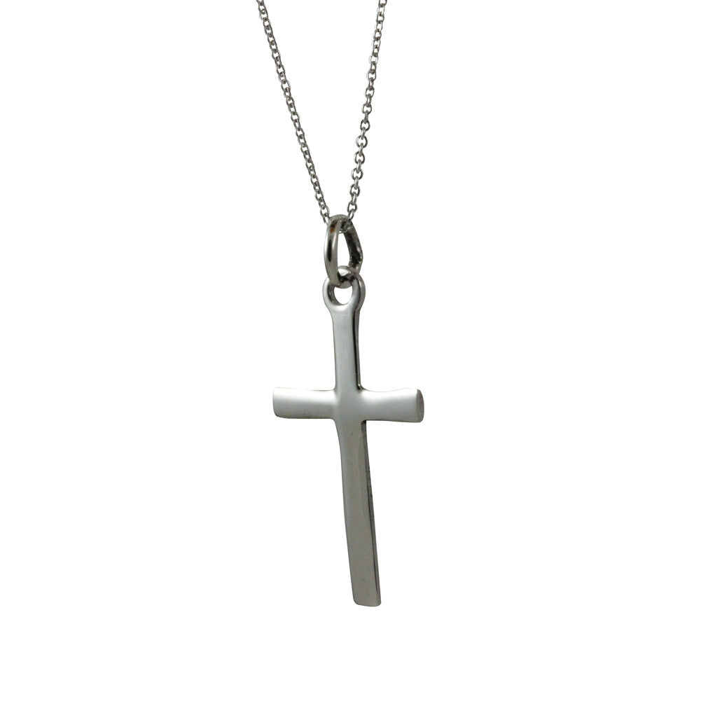 Lovely silver cross necklace. Made of .925 sterling silver. Featuring a 1.25 inch length x .60 inch width silver cross pendant. rolo chain with spring ring clasp perfect for t shirts and layering with a blouse We recommend pairing with your other long silver chains. polished finish.