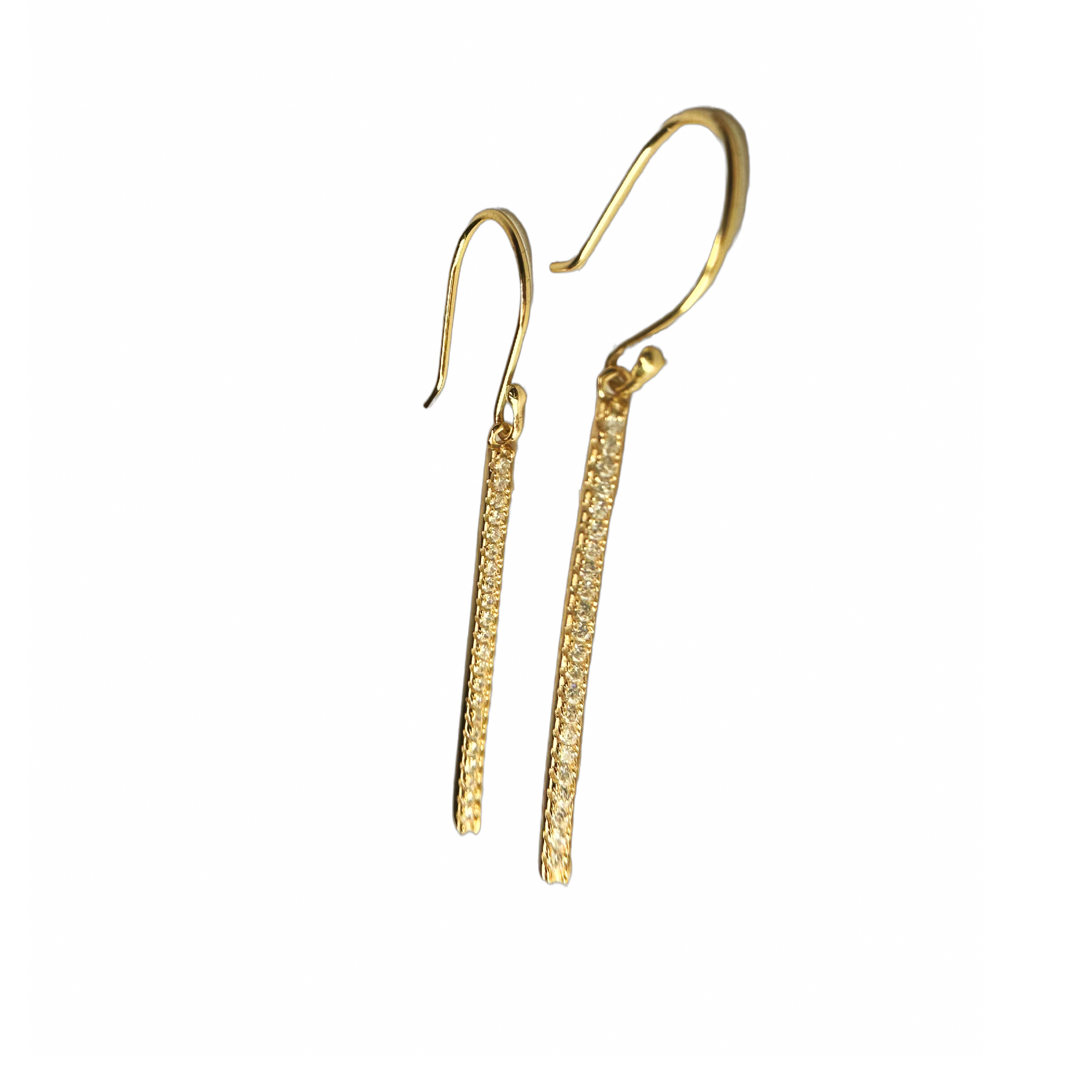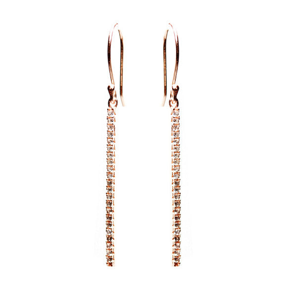 Our "Sparkle Stick" earrings is an ultra chic season staple. Made of .925 sterling silver and dipped ingold. Featuring a simple gold plated vertical bar charm. Sparkle Stick glows with a stunning array of cubic zirconia stones. French Wire Earrings. Looks fashionable and fabulous when layered with complementing rose gold bangles. Sparkle Stick necklace available.