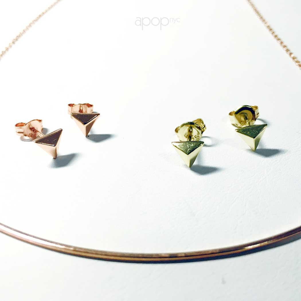 Simple and chic, these gold tiny pyramid stud earrings are made of .925 sterling silver, dipped in rose gold. Studs are crafted with an edgy structured three dimensional design. Polished Finish. Post earrings. We recommend keeping item away from moisture for a longer lasting finish.