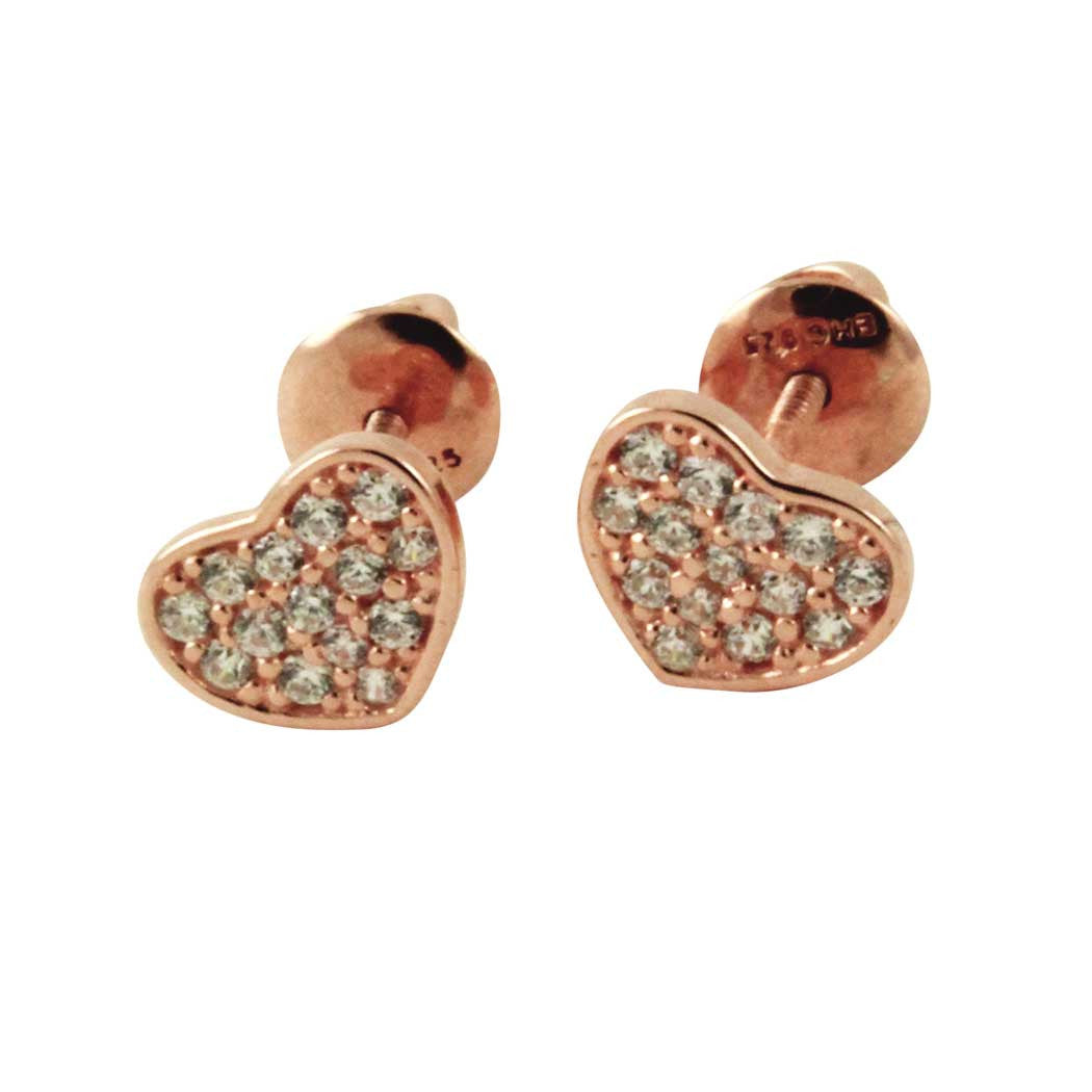 Light up a room with these very versatile and luxurious small heart-shaped stud earrings. Screw back studs are Made of .925 sterling silver and dipped in rose gold. An array of micro pave cubic zirconia stones give these earrings an unforgettable sparkle. Screw Backs are secure. Post earrings lay flat on earlobe. We recommend pairing with a mini solitaire necklace in rose gold for a sophisticated look.