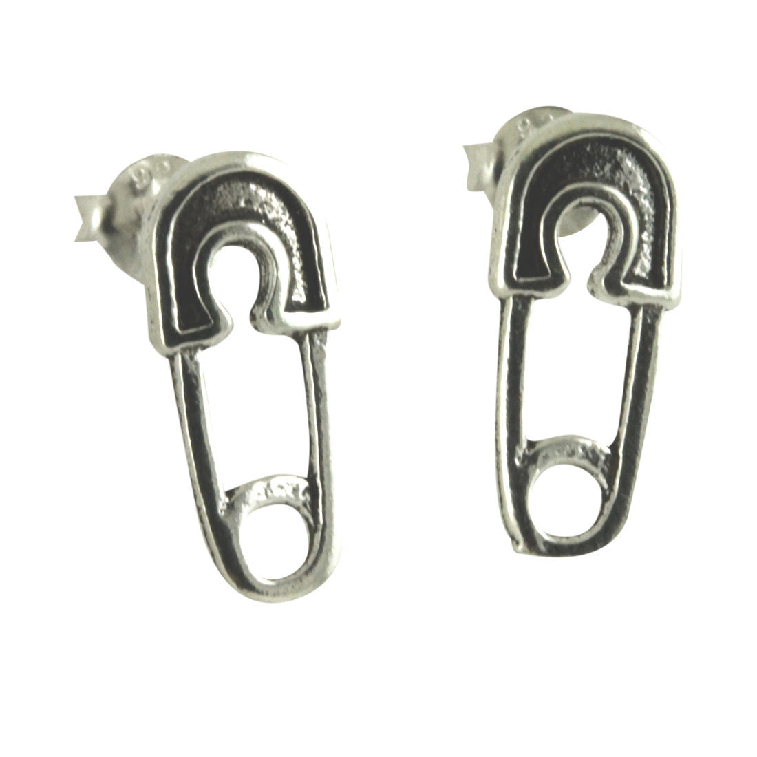 Fashionable safety pin-style earrings. Made of .925 sterling silver.Polished finish. Smooth stud style, wear one, wear both. May be worn horizontal or vertical. Pendant available