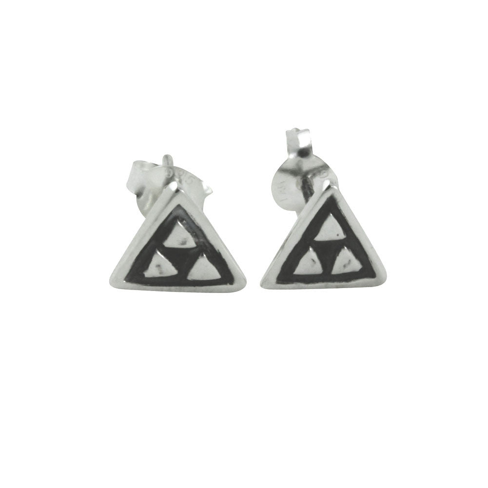 Simple and geometric chic! mini triangle stud earrings are made of .925 sterling silver. Small pyramid Studs are crafted with an edgy dimensional design. Three triangles adorn the center of this mini stud. polished finish. Post earrings.