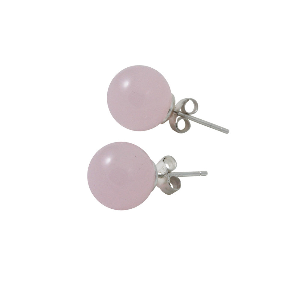 A light and pink pair of rose quartz bead stud earrings. Made of .925 sterling silver. Post earrings. Features a round rose quartz bead in a light pink shade. This natural and smooth stone gives off hints of glamour and easily pairs with many outfits.