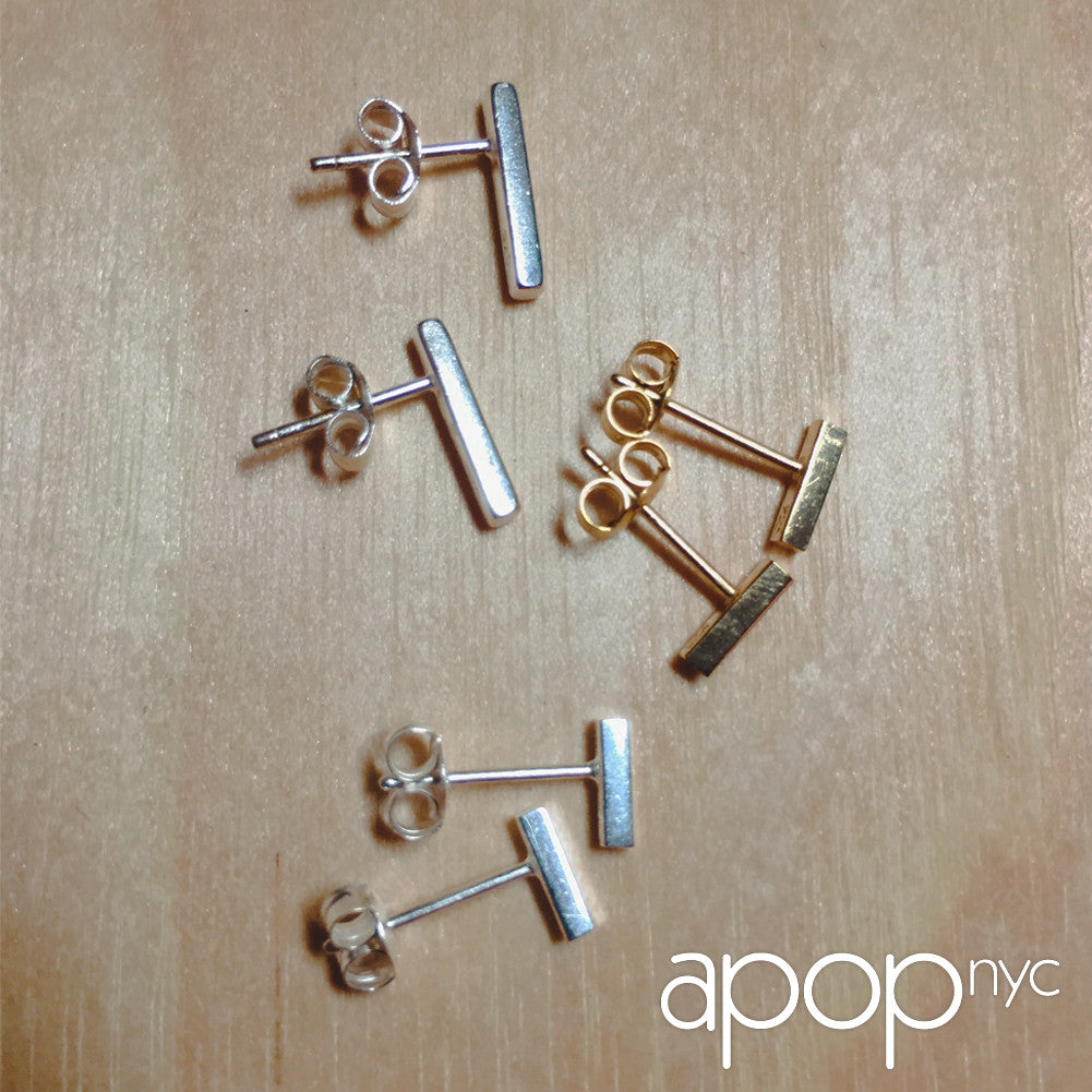 Fashionable and versatile "tiny" mini bar stud earrings. Made of .925 sterling silver. smaller than our standard bar stud earrings. Polished finish gives earrings a unique touch. 4 dimensional tiny rectangle bar, wear one, wear both. Tiny bar earrings can be worn horizontal or vertical.