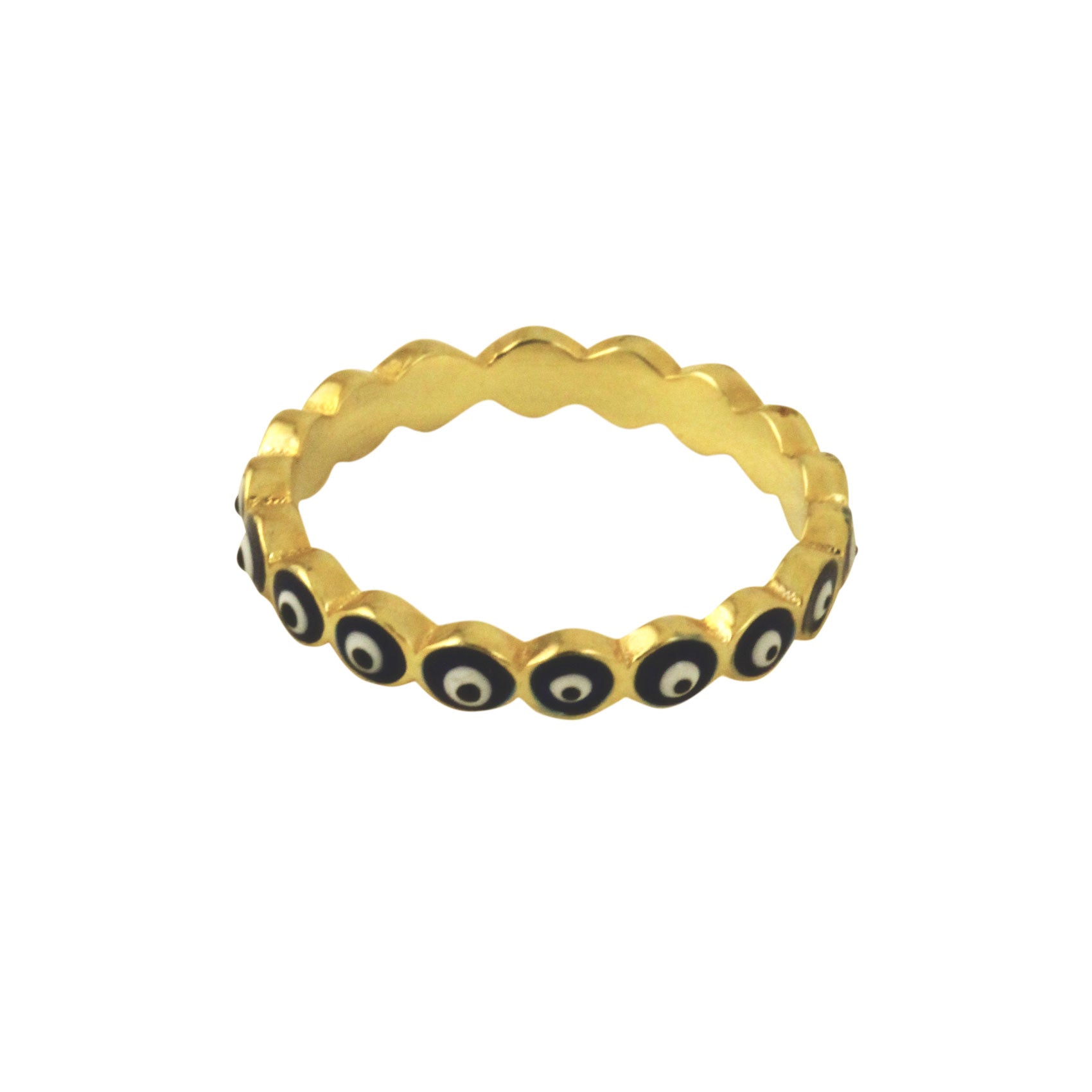 Unit price / perChic and blue! gold mini eye ring. Made of .925 sterling silver, plated in gold and enamel accents. Plenty of round blue eyes for protection. Can be worn alone or stacked.